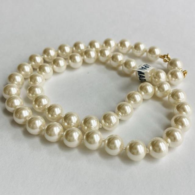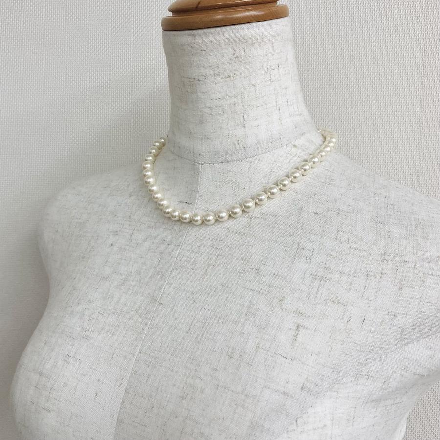こちらはガラス素材の原玉を使用したオリジナル日本製ガラスパールネックレスです。パールとパールの間に1つづつ結び目を入れたオールノット仕様で、ワンランク上のコスチュームジュエリーとなっております。パールサイズは直径約8mmサイズで、長さは全長約42cmと標準的なプリンセスサイズになっております。ガラスパール特有の高級感漂う重みとオールノット仕様で存在感のあるネックレスになっております。※オールノット加工は、玉同士に隙間があるため擦れ合いにくく・キズなどが付きにくい、又、結び目があることで動きがありしなやかさもある、更に、万が一糸が切れてしまった時でも最小限で抑えられる等が特徴です。