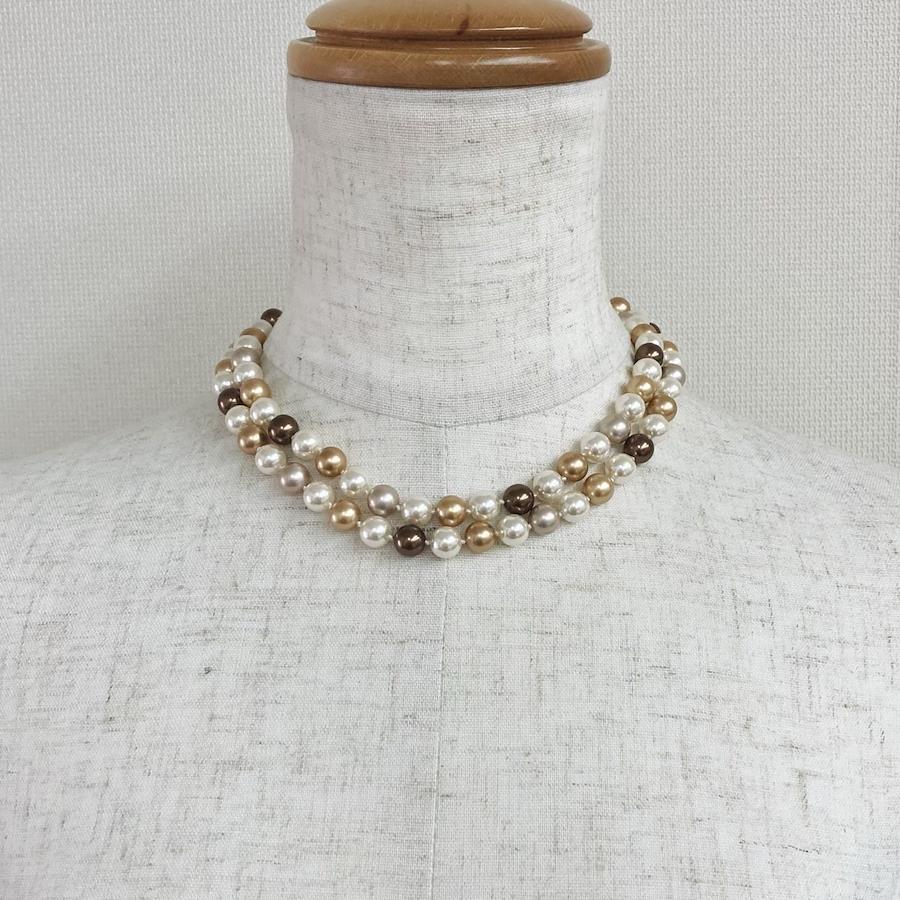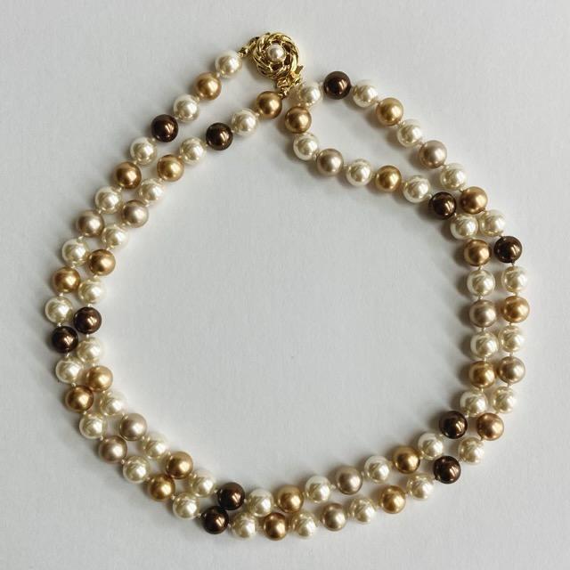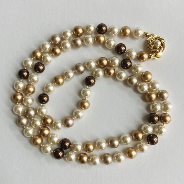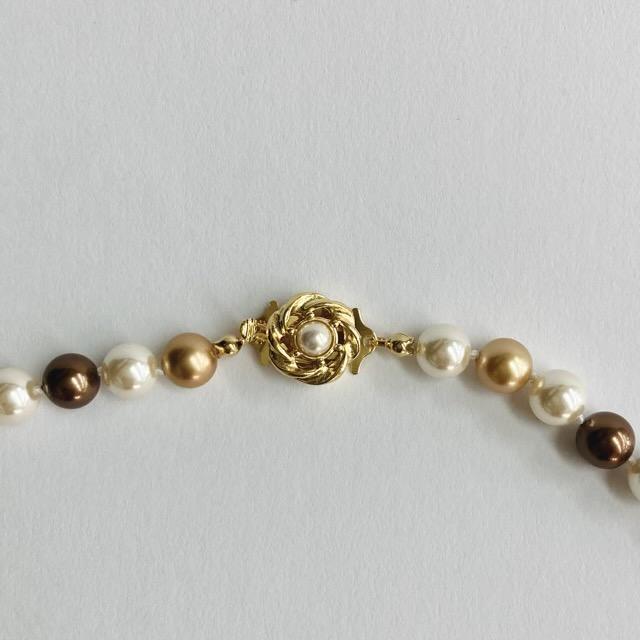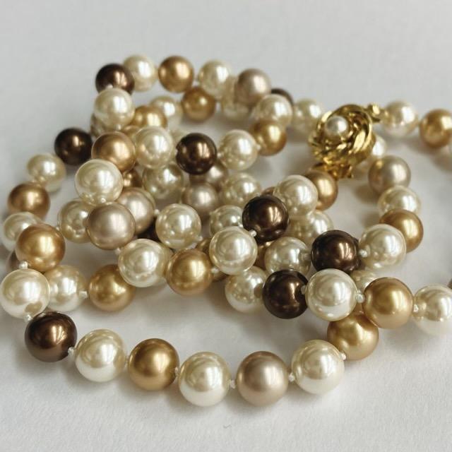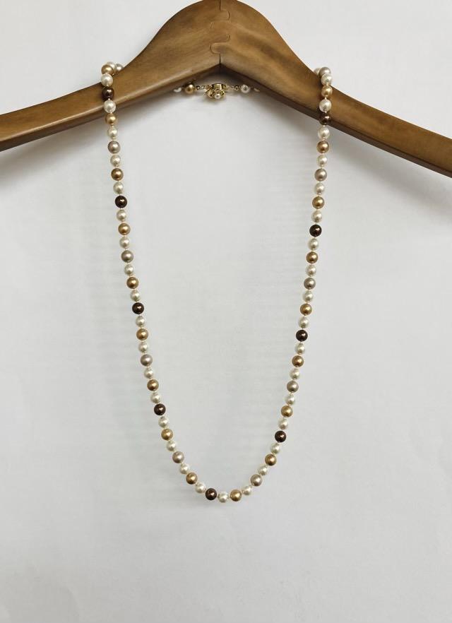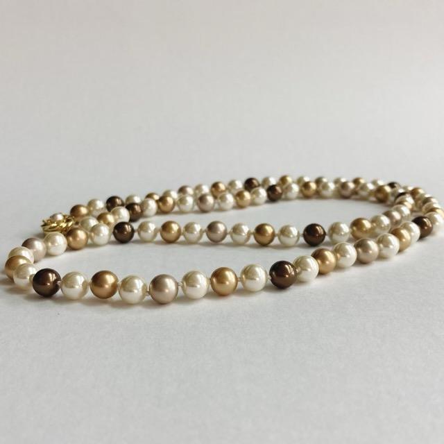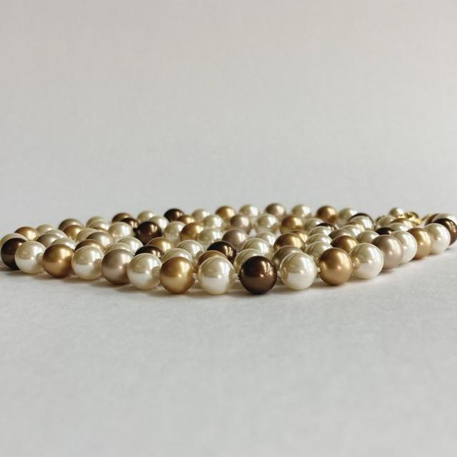 パールは当店のオリジナルカラーで、きめ細かい質感と程良い艶感が特徴のブラウン計パール各種をmixして使用しております。※原玉にはピンホールや小さい凹み等が見られる場合がございますが、自社にて検品の上許容範囲とさせて頂いております。