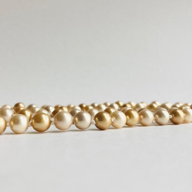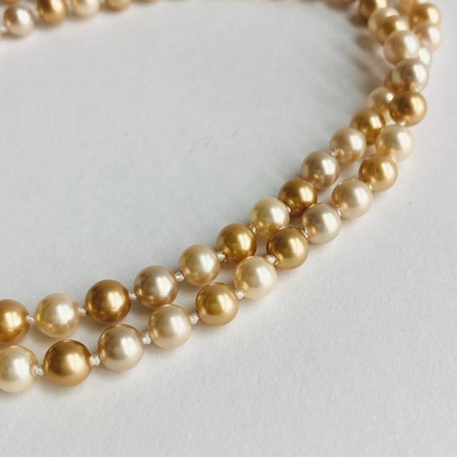 オールノットネックレスの特徴として、万が一糸が切れた場合でもばらばらにならず最小限で抑えられる点や、玉同士が密着していないので擦れあいにくく傷も付きにくい点・また玉同士が少し離れている為、首回りにフィットしやすくなっている点等がございます。この仕様は特に海外で人気があり、比較的高品質アクセサリー類によくみられる仕様です。※弊社の自社工場にて塗装したパールになります。品質の状態も維持されており、剥がれや大きな目立った傷などもございません。稀にピンホールや小さい凹み等が見られる場合がございますが、自社にて検品の上、品質に問題は無く許容範囲とさせて頂いております。