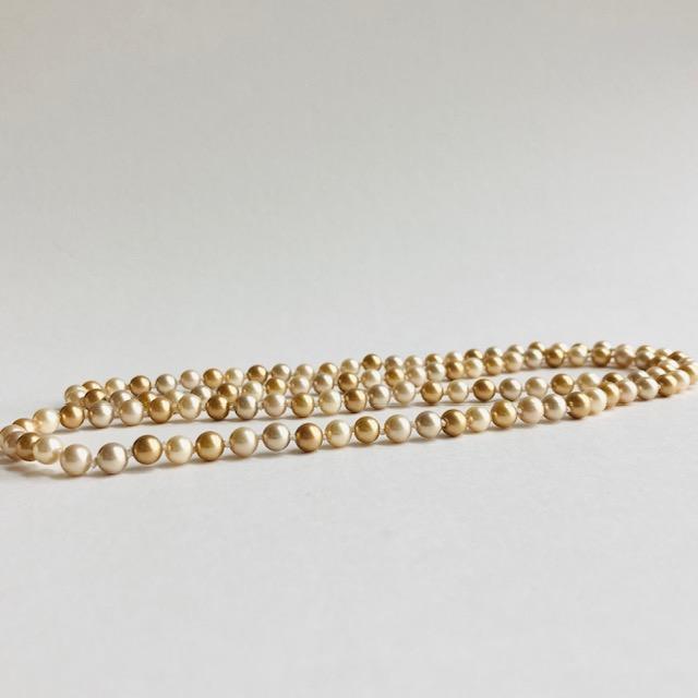 こちらはガラス素材の日本製ガラスパールを使用しております。パール間には1つづつ丁寧に結び目を加えたオールノット加工にて仕上げしました。複数の異なるカラーのガラスパールをランダムに通したシンプルなネックレスになっております。パールサイズはやや小粒な直径約6mm玉で、長さは手軽に被ってゆったりお使い頂ける全長約80cmに。金具類を一切使用しないエンドレス加工の為、金属アレルギーの心配も無く脱着も簡単です。パールカラーはきめ細かい質感と程良く優しい艶感が特徴のベージュ系パール各種をランダムに使用しました。ちょっとしたお出かけや普段使いにも気軽にお使い頂けます。
