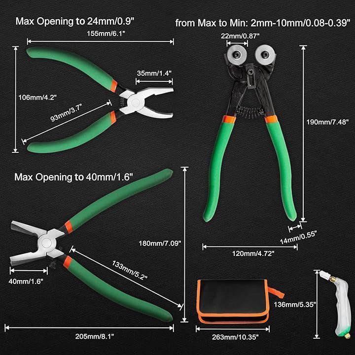 サイズ:タイルペンチ:190 x 120 x 14mm / 7.48 x 4.72 x 0.55 ;ガラスペンチ:205 x 45 x 14mm / 8.1 x 1.8 x 0.6; グローザープライヤー:155 x 106 x 14mm / 6.1 x 4.2x0.6。