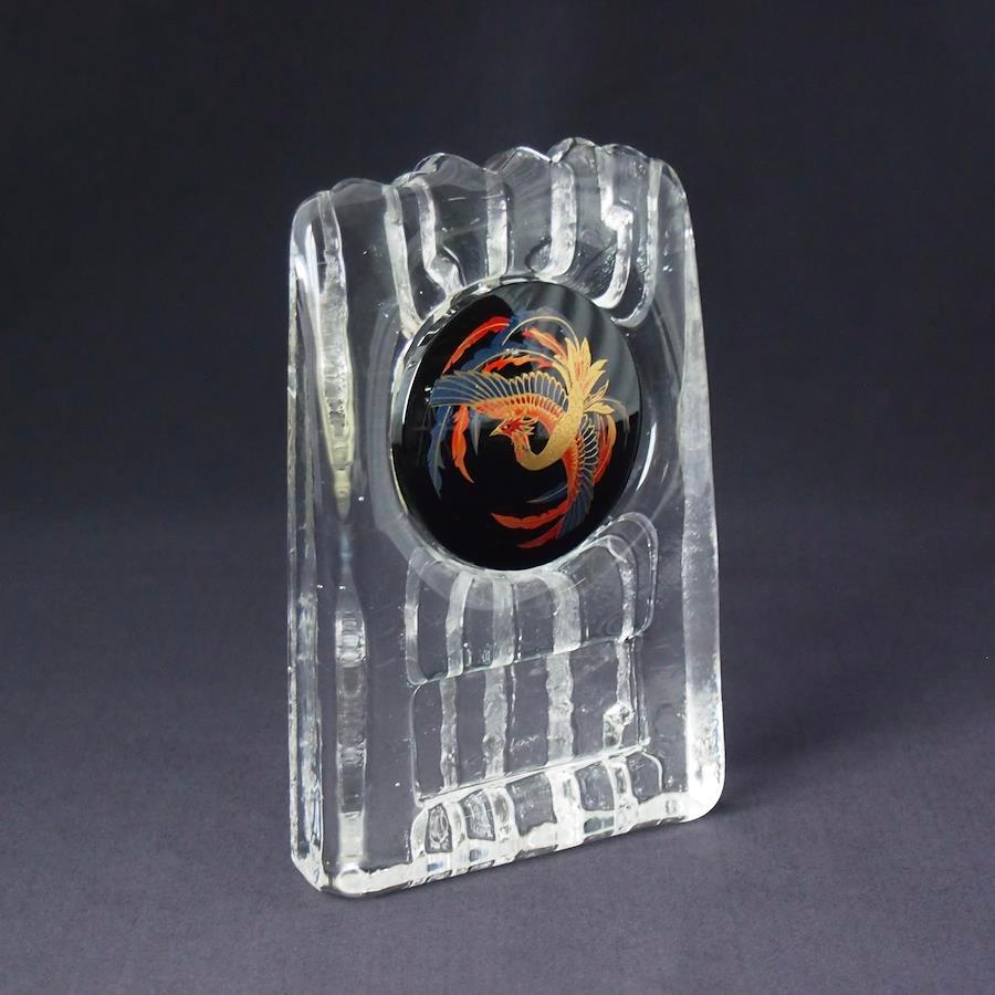 日本らしいデザインのイラストがガラス本体と調和したモダンな商品です。お部屋のインテリアにお勧めです。本体はガラスでイラストは樹脂に鶴を蒔絵の様に印刷を施しております。表彰や感謝の贈呈品、お部屋のインテリア雑貨としてご利用いただけます。ケースの底面に多少、汚れあり