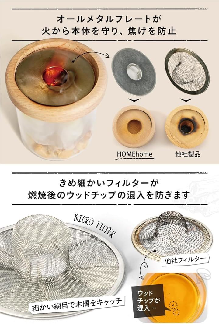 また、プレートと一体型となっているきめ細かいフィルターが、燃焼したウッドチップを通さず、食べ物への混入を防ぎます。