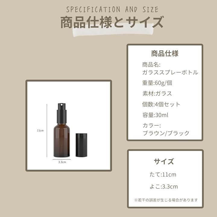 「商品仕様」商品名:ガラススプレーボトル 4個セット 重量:60g/個 素材:ガラス 個数:4個セット 容量:30ml サイズ:縦11cm 横3.3cm カラー:ブラウン