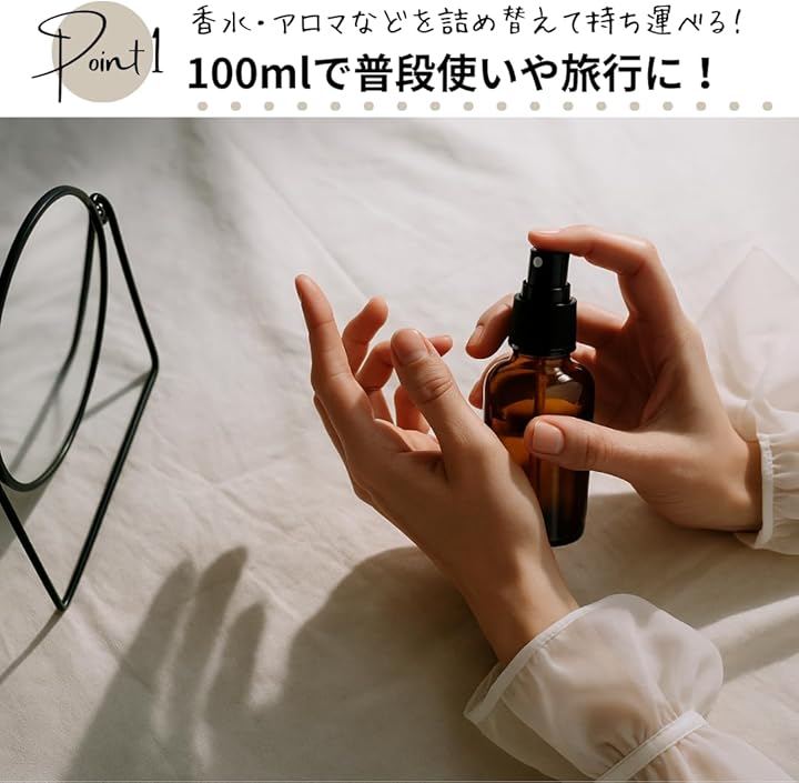 「旅先でも、いつもの香りとケアを持ち歩く」香水や化粧水、ヘアミストの小分けにぴったり。