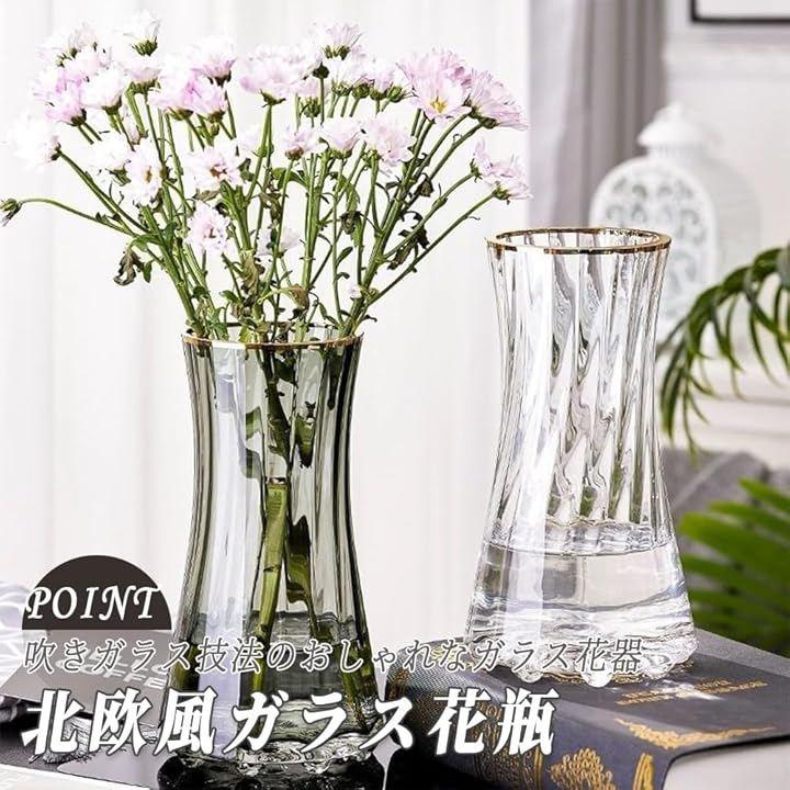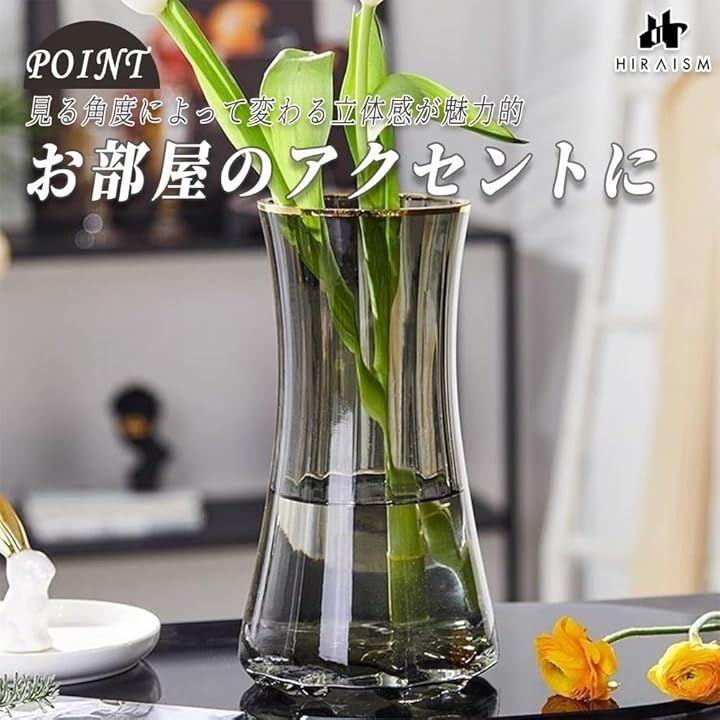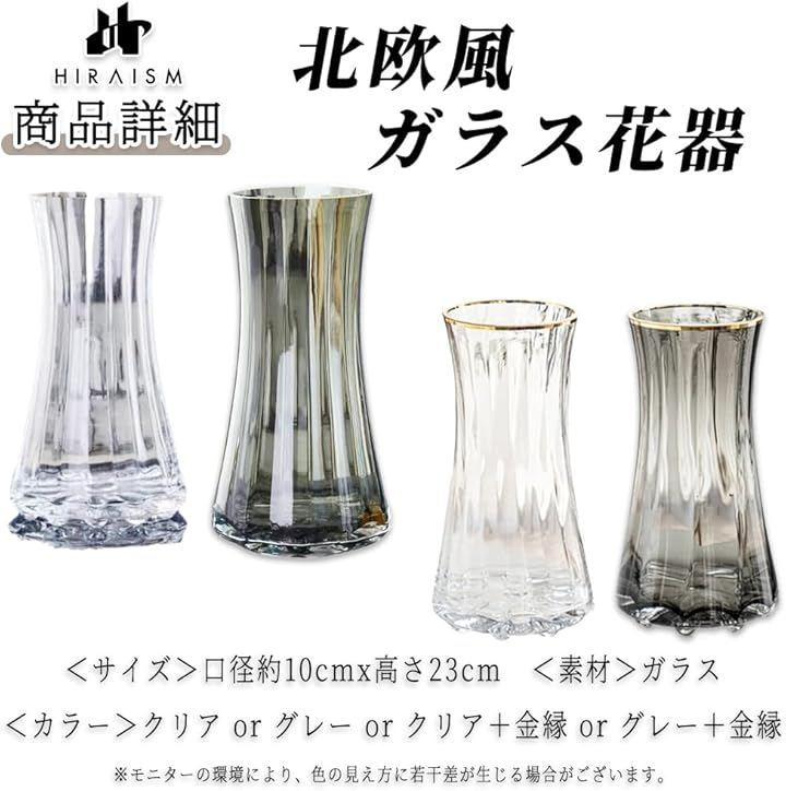 「商品内容」北欧風ガラス花瓶 <サイズ>口径約10cmxx高さ23cm <素材>ガラス <カラー>クリア or グレー or クリア+金縁 or グレー+金縁 *モニターの環境により、色の見え方に若干差が生じる場合がございます。