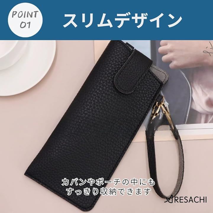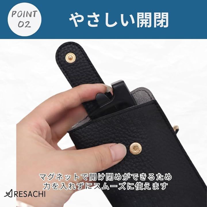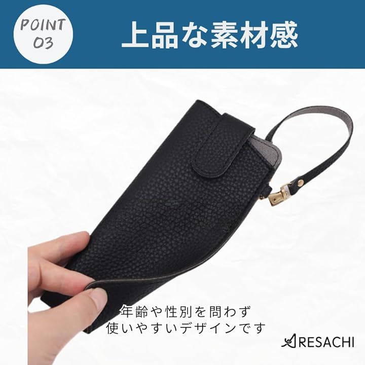 「レザー調の上品な素材感」高級感のあるレザー調の素材が使用されており、大人っぽい落ち着いた印象を与えます。