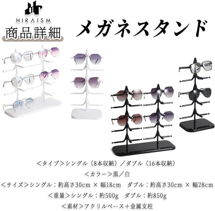 「商品内容」メガネスタンド <タイプ>シングル(8本収納)/ダブル(16本収納)より選択可 <カラー>黒/白 <サイズ>シングル:約高さ30cm x 幅18cm ダブル:約高さ30cm x 幅28cm <重量>シングル:約500g ダブル:約850g <素材>アクリル