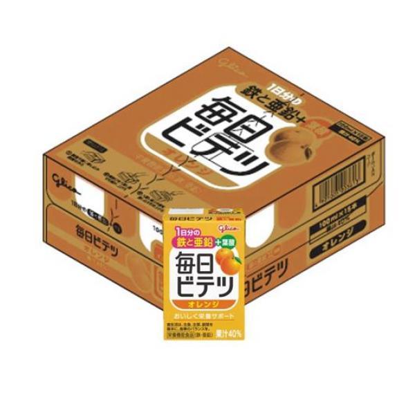 製品の特徴●グリコ 毎日ビテツ オレンジ●1日分の鉄と亜鉛+葉酸●おいしく栄養サポート●鉄分や妊娠中に大切な亜鉛に加え、葉酸、カルシウム、食物繊維など、6種類の栄養素が手軽に摂れます。●1本100mLの飲み切りやすいサイズ。●甘みと酸味のバランスが絶妙な、スッキリした味わいです。●果汁40%●紙パックドリンク●栄養機能食品(鉄・亜鉛)◇鉄は、赤血球を作るのに必要な栄養素です。◇亜鉛は、味覚を正常に保つのに必要な栄養素です。◇亜鉛は、皮膚や粘膜の健康維持を助ける栄養素です。◇亜鉛は、たんぱく質・核酸の代謝に関与して、健康の維持に役立つ栄養素です。●名称:40%オレンジ果汁入り飲料