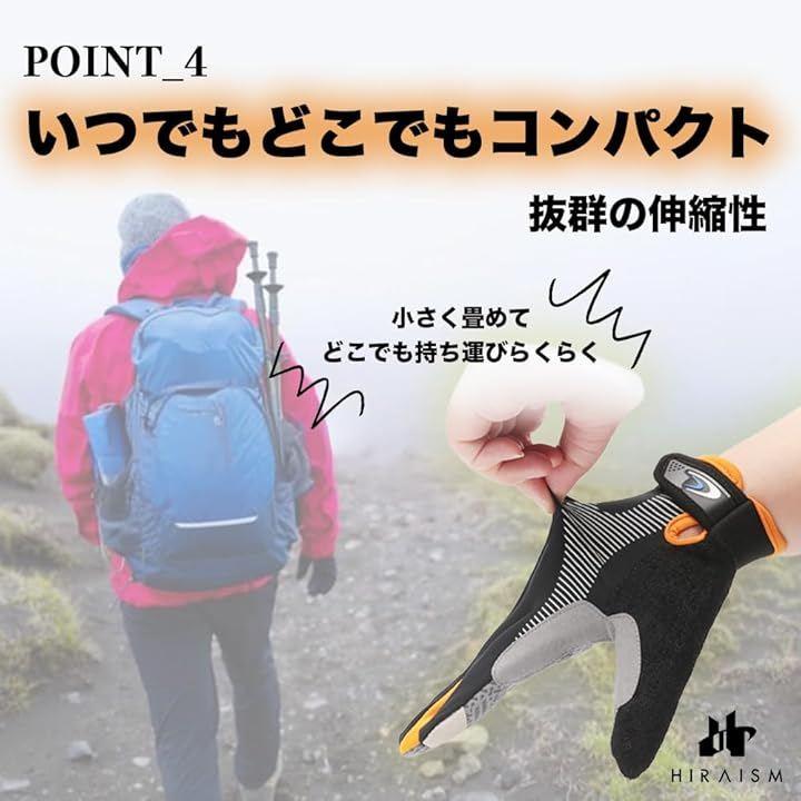 「一度掴めば滑りにくい、優れたグリップ力のグローブ」手のひら部分から指先まで満遍なく滑り止め加工が施されており、トレッキングポールや岩場でもしっかり握れる設計で安全性をサポートします。