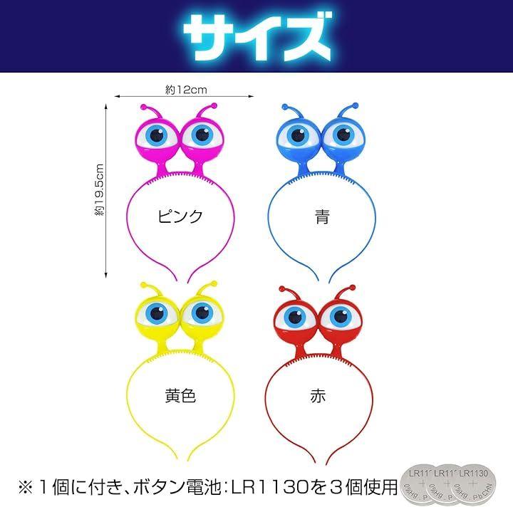 「光るカチューシャ 仕様」 *内容:赤・青・黄色・ピンクの4色4個セット(電池交換式) *サイズ:約横12x縦19.5cm *重さ:約36g *ボタン電池:LR1130を3個使用(テスト用の電池内蔵。