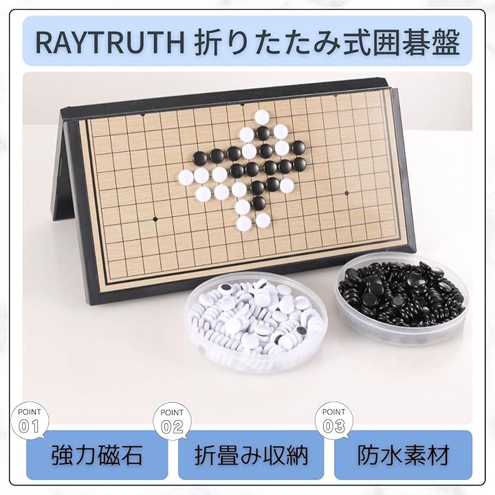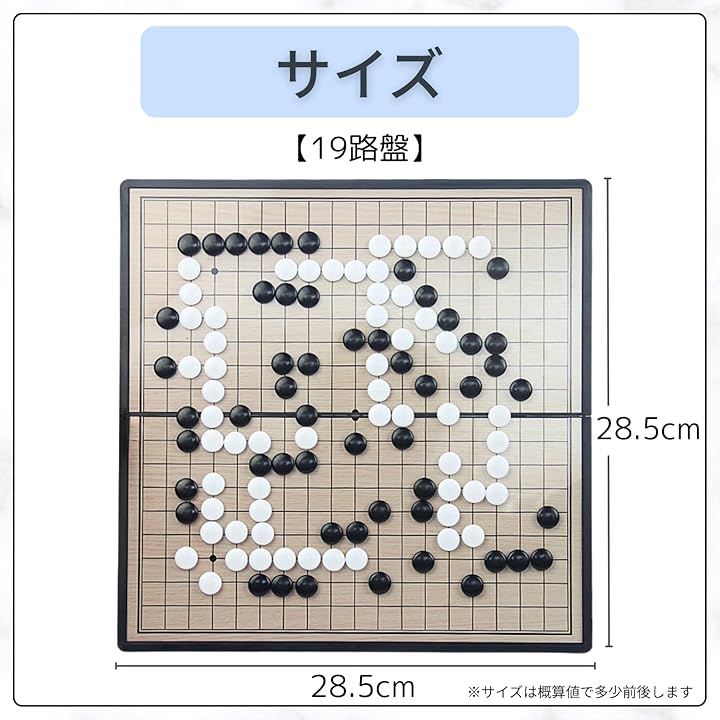「商品仕様」サイズ:約28.5x28.5cm(19路盤)、セット内容:折りたたみ式磁石碁盤x1、碁石361個、碁石収納ケース(*本製品は過剰な包装を避け、環境への負担を抑えるミニマルパッケージでお届けします。