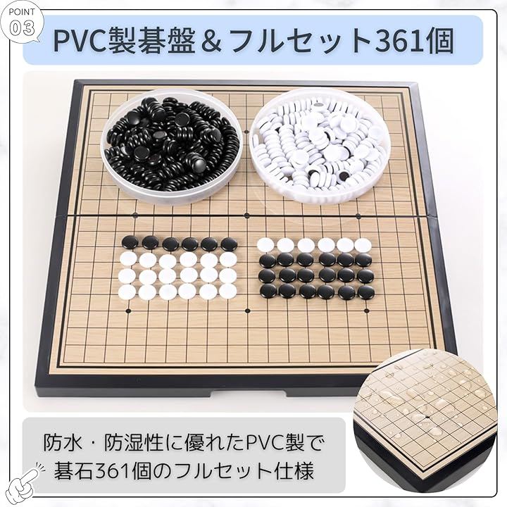 「PVC製碁盤&361個フルセットの碁石」碁盤・碁石ともに環境に配慮したPVC素材を採用し、傷や汚れに強く日常使いにぴったり。