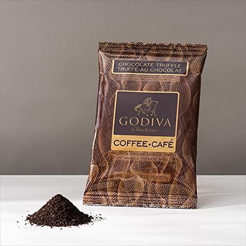 ゴディバ(GODIVA)のコーヒー。アラビカ種コーヒー豆をていねいに焙煎して挽いた豊かな香りをそのままパックしました。チョコレートの香りとコーヒーが織り成すハーモニー。香ばしくクリーミーな味わい。* トリュフチョコレートをイメージした、チョコレート香料で風味付けしたフレーバーコーヒーです。【淹れ方】ドリップ、コーヒーメーカーで通常のレギュラーコーヒー1カップ(140cc)あたり、10~12gをご使用ください。(お好みによりコーヒーの量を調整してください。)