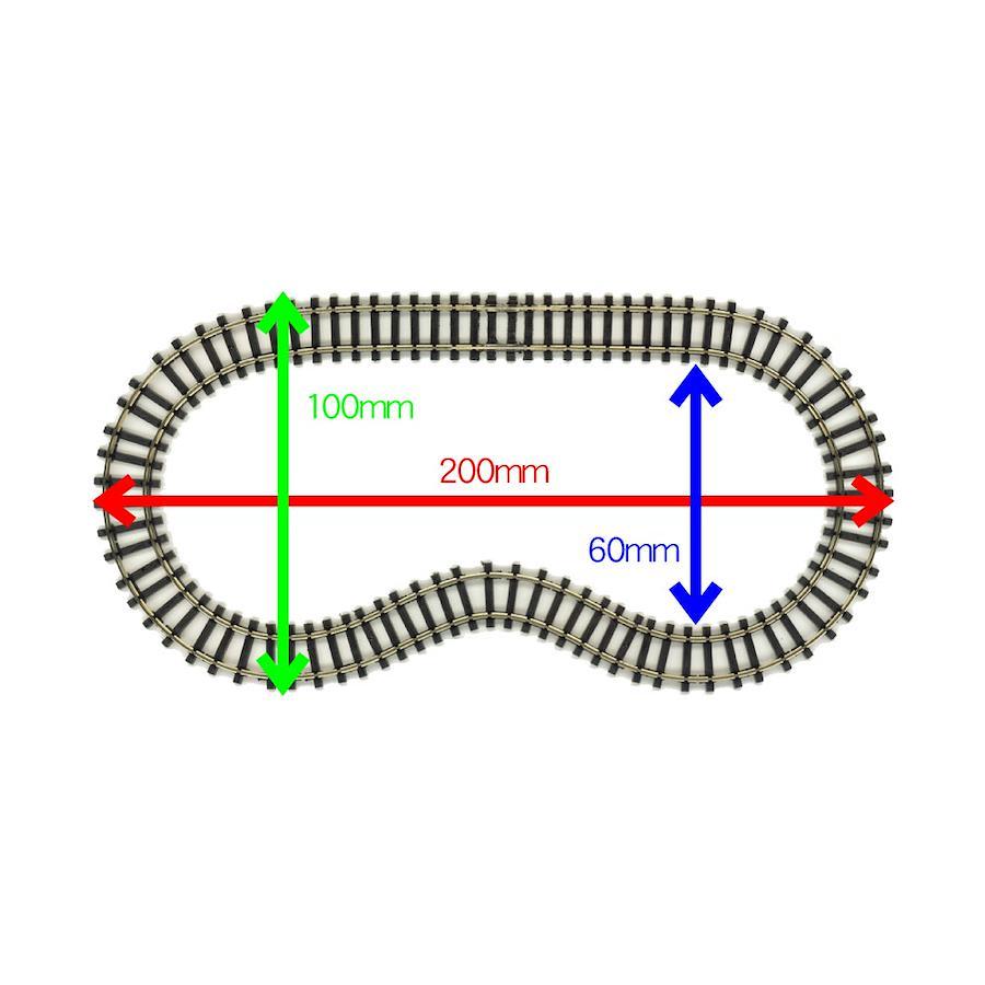 ●レール寸法(最大): 約200mm × 約100mm、実際には車両が走行時に当たらないように、より線路から離れたエリアに建物などの模型を設置する必要あり。● 線路幅:9mm(枕木のピッチはNをイメージ)