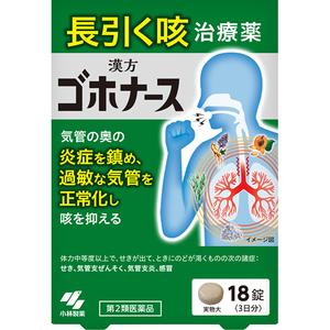 ■商品概要メーカー:小林製薬商品名:ゴホナース 18錠医薬品分類:第2類医薬品区分:その他小児用区分:兼用薬剤形状:錠剤・丸剤・カプセル内容量:18錠商品概要:●風邪でもないのに咳が続いている人のための漢方薬です。●飲みやすい錠剤タイプです(1回3錠、1日2回食前又は食間に服用してください) 。●漢方処方「麻杏甘石湯」が、気管の奥の炎症を鎮めて気管を正常化し、長引く咳を治療します。【使用期限】出荷時点で使用期限終了まで1年以上JANコード:4987072087916商品コード:075663449