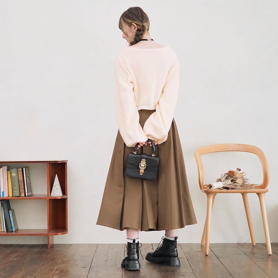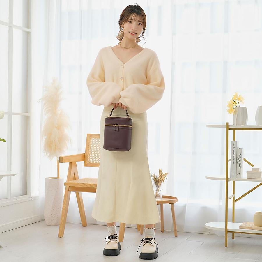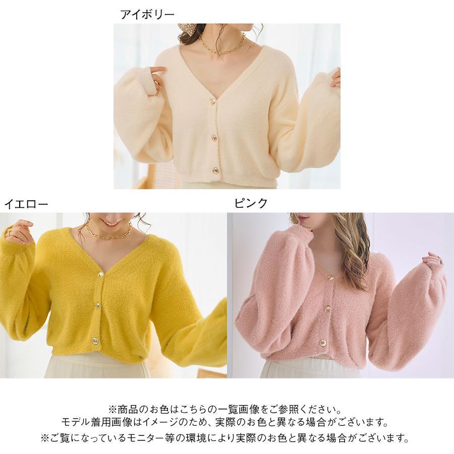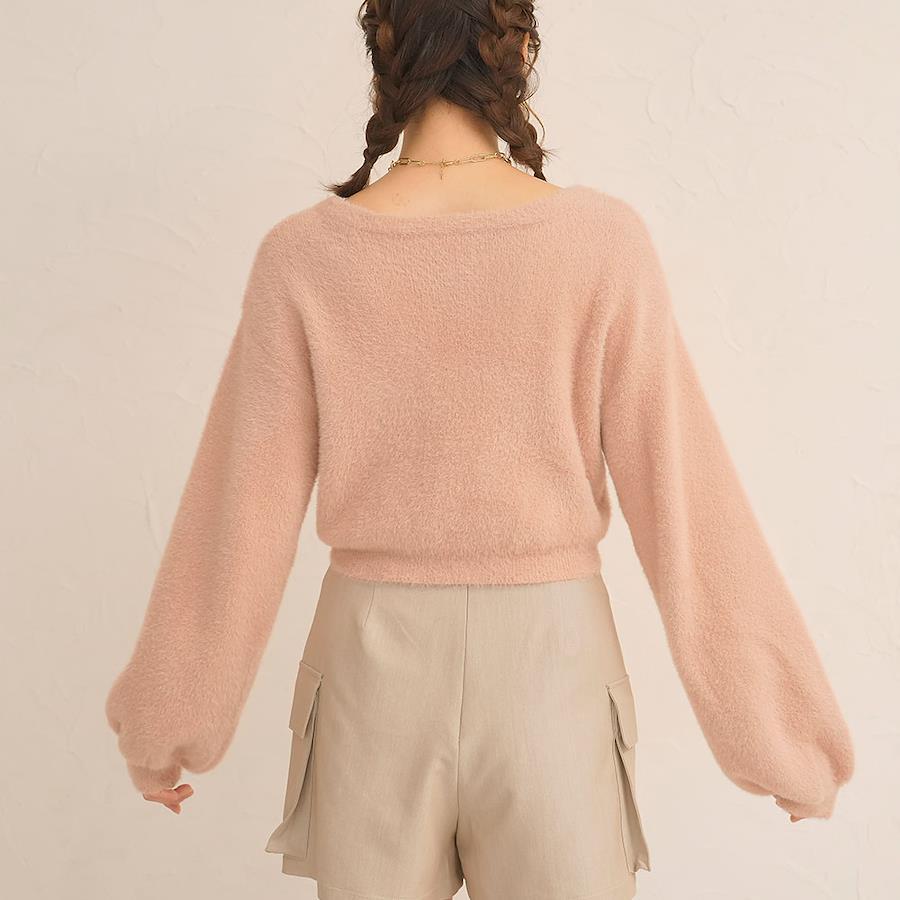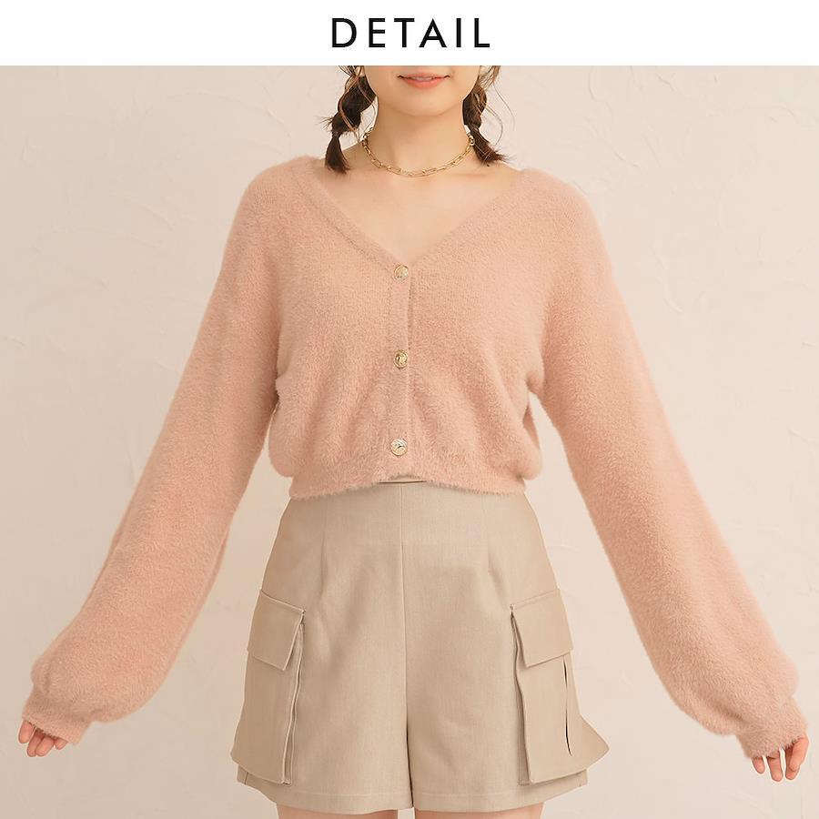 【デザイン】コンパクトな丈感が今年らしいアイテム。程よくあいたVネックは、1枚でトップスとして着ても中にインナーを着てもネックラインを綺麗に見せてくれます。ぽわっとした袖がガーリースタイルにぴったり◎やや落ち感があるので、着膨れ感なくすっきりと着ていただけます。