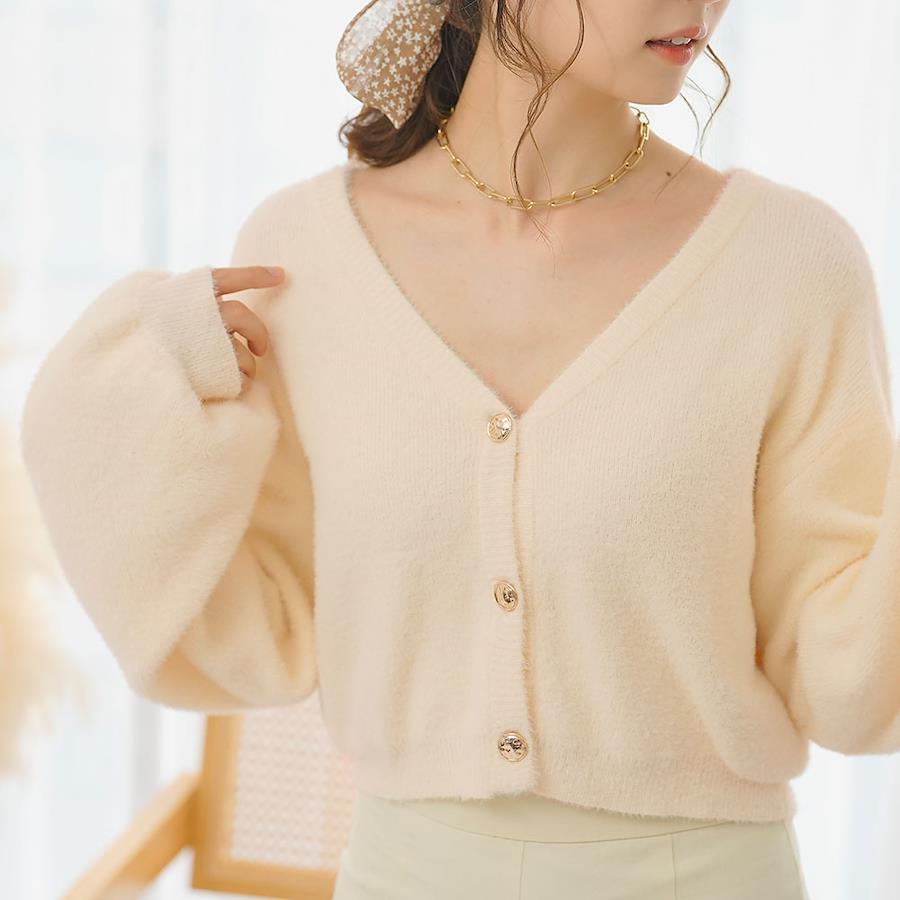 【デザイン】コンパクトな丈感が今年らしいアイテム。程よくあいたVネックは、1枚でトップスとして着ても中にインナーを着てもネックラインを綺麗に見せてくれます。ぽわっとした袖がガーリースタイルにぴったり◎やや落ち感があるので、着膨れ感なくすっきりと着ていただけます。