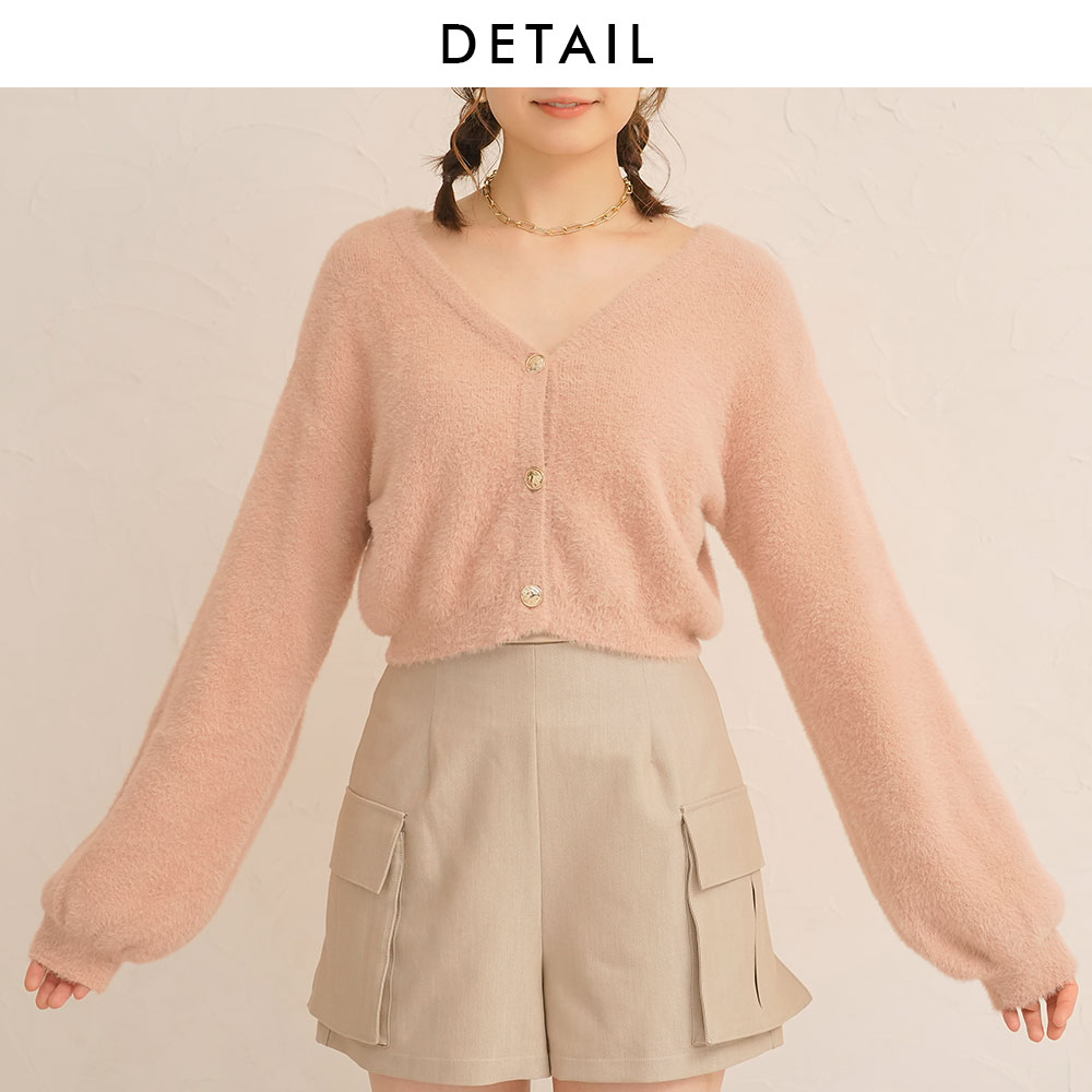 【デザイン】コンパクトな丈感が今年らしいアイテム。程よくあいたVネックは、1枚でトップスとして着ても中にインナーを着てもネックラインを綺麗に見せてくれます。ぽわっとした袖がガーリースタイルにぴったり◎やや落ち感があるので、着膨れ感なくすっきりと着ていただけます。