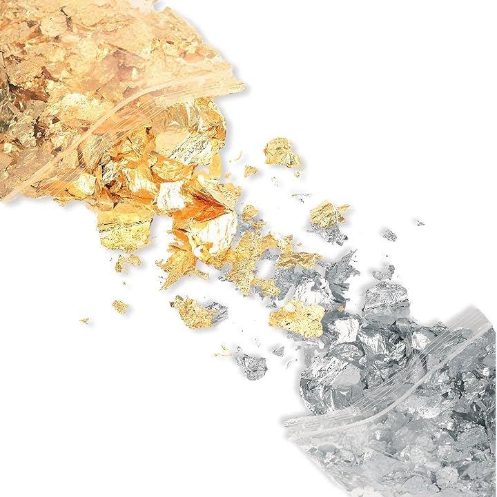 セット内容:金箔、銀箔(合金の模造箔)ケース込みで約3gを各2個のセット、ピンセット(プラスチック製)1個