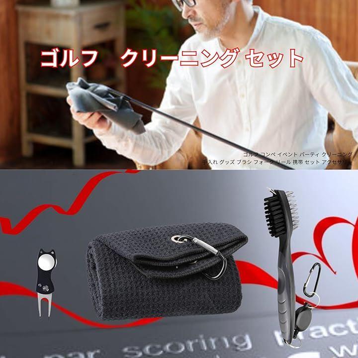 クラブの溝を清潔に保つゴルフブラシ、マグネット着脱式ボールマーク付きの芝修理用ゴルフフォーク、そしてマイクロファイバー製の速乾ゴルフタオルがセットになっています。