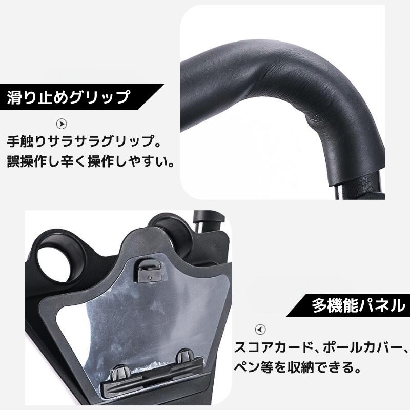 スコアカードやボール、ペンなどを収納できる多機能パネル付きで、プレー中の小物整理もすっきり。
