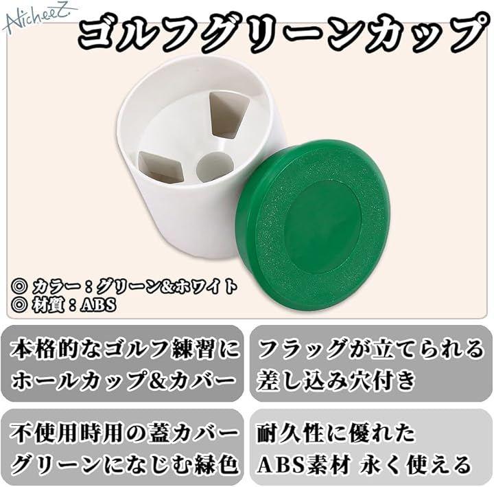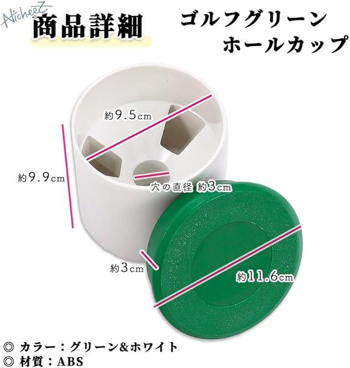 「商品内容」ゴルフグリーンホールカップ 材質:ABSプラスチック カラー:ホワイト・グリーン サイズ:(蓋)外径/約11.6cm 内径/約9.5cm 高さ/約3cm 重量:約87.5g (カップ)高さ/9.9cm 穴の直径約3cm