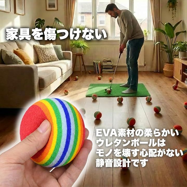 「家具を傷つけない」マンションでも安心の静音・安全設計 自宅でアプローチ練習ができる室内用ゴルフ練習ボールセット。
