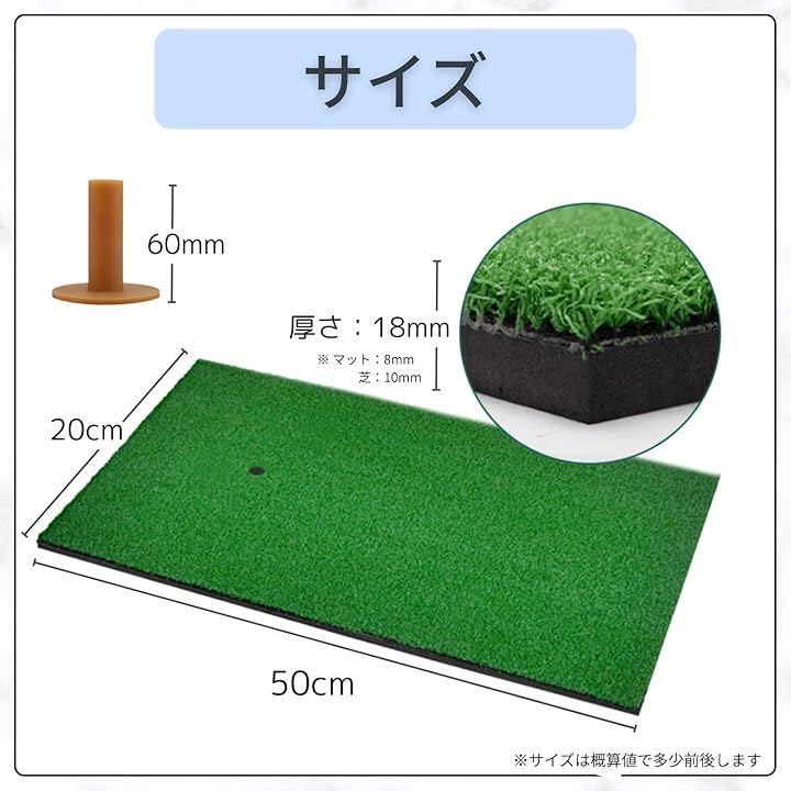「商品仕様」サイズ:20x50cm、厚さ:約18mm、付属品:ゴム製ティー(高さ60mm)、用途:室内外のスイング練習(*本製品は過剰な包装を避け、環境への負担を抑えるミニマルパッケージでお届けします。
