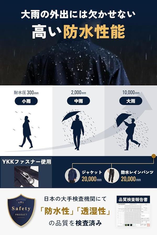 「重量」ジャケット約330g、パンツ約240g「メイン素材」 ポリエステル「利用シーン」ゴルフ 「機能」*防水/撥水加工(耐水圧20,000mm)、防風 「サイズ」 M~2XL <ジャケット> 着丈(背面) / 胸囲 / 袖丈 [M] : 69.5 / 117 / 63.5 [L] : 71.5 / 123 / 65 [XL] : 73.5 / 129 / 66.5 [2XL]: 75.5 / 135 / 68<パンツ> ウエスト / 着丈 [M] : 80‑110 / 109 [L] : 84‑114 / 111.5 [XL] : 88‑118 / 114 [2XL]: 92‑122 / 116.5