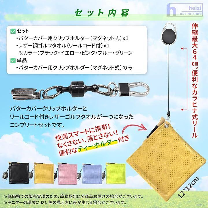 「商品内容」[2点セット] セット内容:レザー調ゴルフタオル(リールコード付)x1,パターカバー用クリップホルダー(マグネット式)x1 カラー:ブラック、イエロー、ピンク、ブルー、グリーン [単品]パターカバー用クリップホルダー(マグネット式)のみもお選びいただけます。