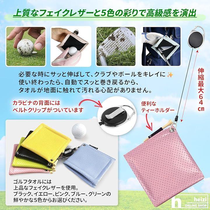 「リールコード付きタオルで常にクリーン&快適」リールが伸びてクラブやボールを素早く拭ける便利なタオルです。