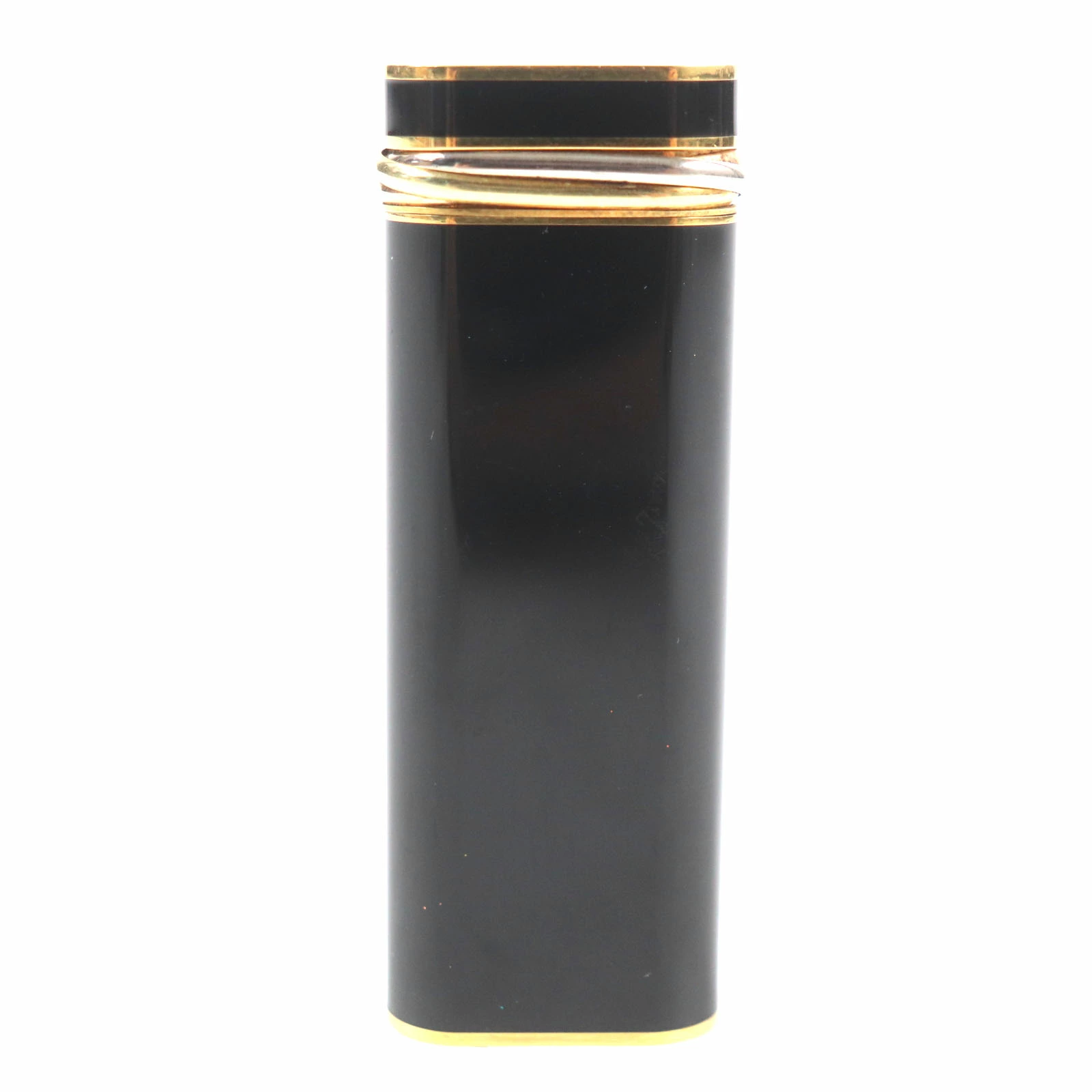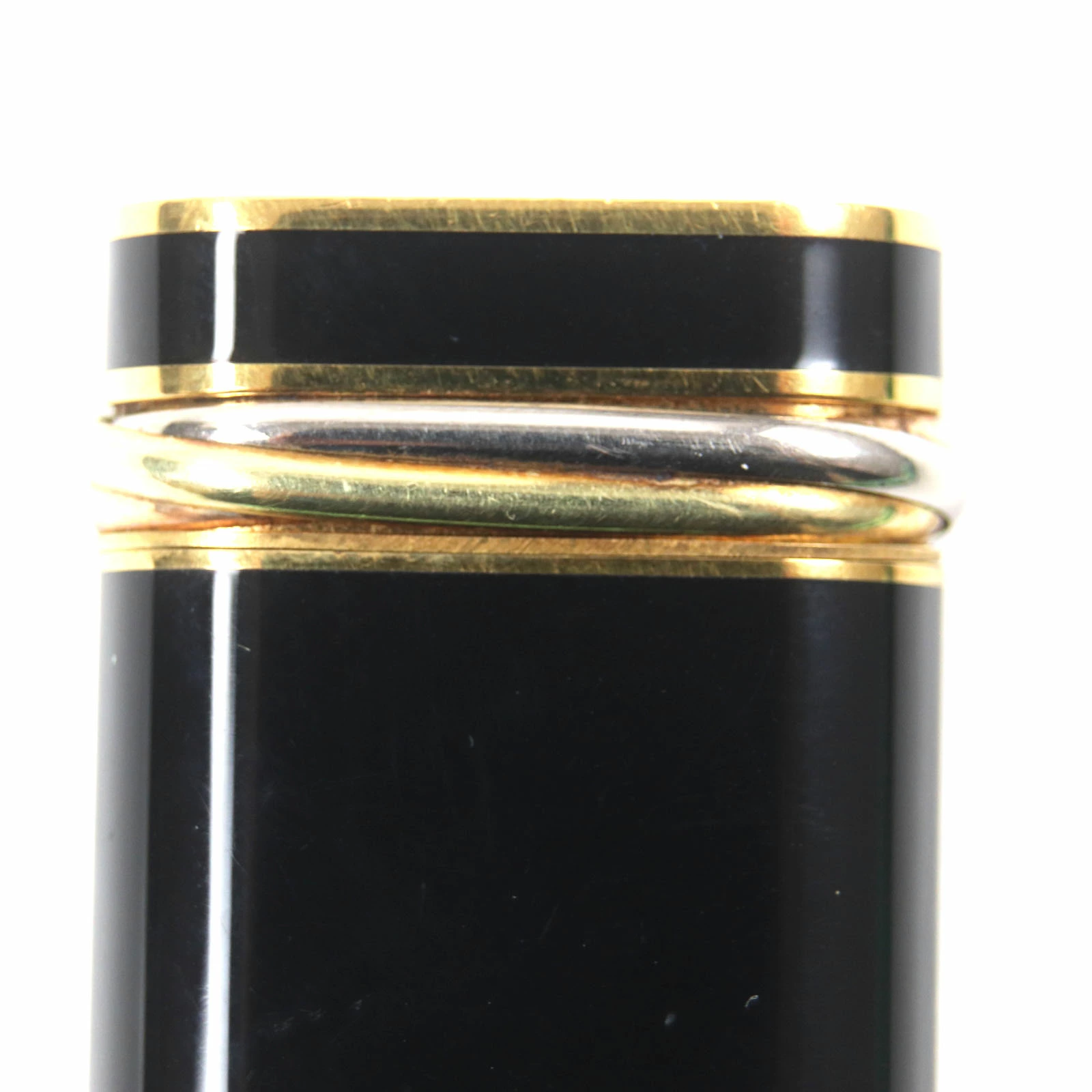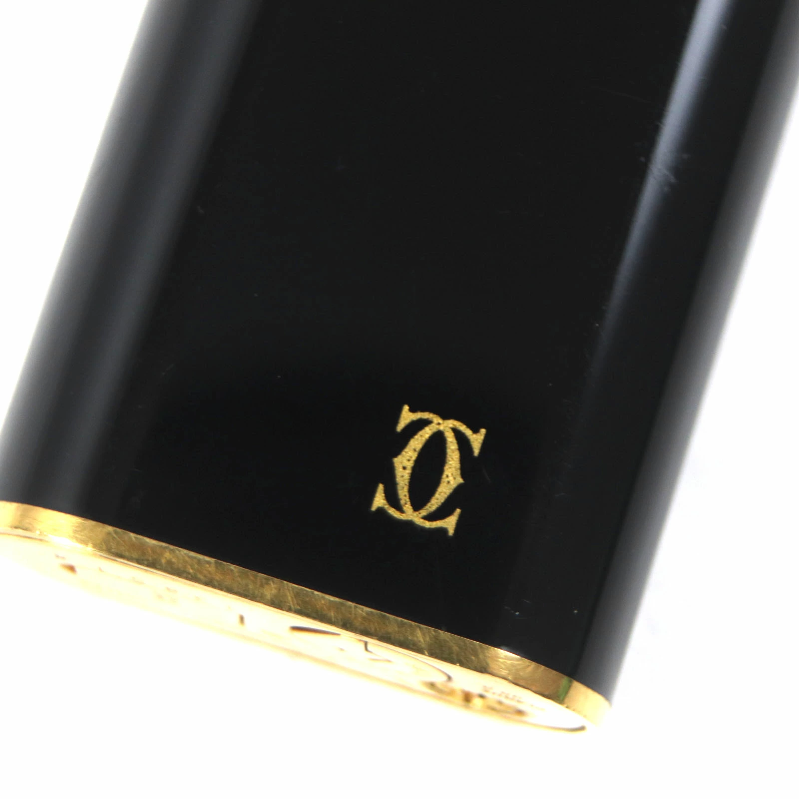Good condition: Cartier Trinity new oval lacquer logo roller gas lighter in black and gold. Swiss-made, men's. Ignition confirmed. [Pre-owned]