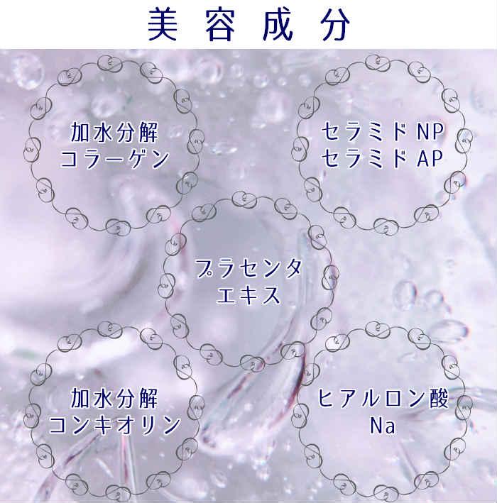 【全成分】エタノール、水(メタクリル酸エチルベタイン/アクリレーツ)コポリマー、BG、アクリレーツコポリマー、加水分解コラーゲン、セラミドNP、セラミドAP、プラセンタエキス、加水分解コンキオリン、ヒアルロン酸Na、グリチルリチン酸2K、PEG-60水添ヒマシ油、水酸化K、カプリル酸グリセリル、エチルヘキシルグリセリン