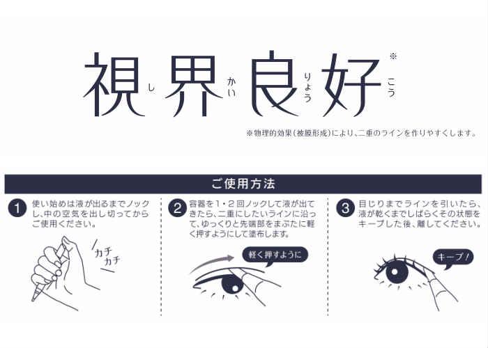 【使用上および保管上の注意】●傷やはれもの、しっしん等、異常のある部位にはお使いにならないでください。●お肌に異常が生じていないか、よく注意してご使用ください。化粧品がお肌に合わないとき、即ち次のような場合には使用を中止してください。そのまま使用を続けますと、症状を悪化させることがありますので、皮膚科専門医等へのご相談をおすすめします。・使用中、赤み、はれ、かゆみ、刺激、色抜け(白斑等)や黒ずみ等の異常が現れた場合・使用したお肌に直射日光があたって、上記のような症状が現れた場合●目に入らないようご注意ください。入った場合は、こすらずにすぐ洗い流してください。目に異物感が残る場合は、眼科医にご相談ください。●本品は皮膜成分の力でまぶたの皮膚を折り曲げた状態に保つため、刺激を感じる場合があります。刺激が生じたらすぐに使用を止め、皮膚科専門医等にご相談ください。●ファンデーション、汗、皮脂がヘラに付くと液が出にくくなったり、目詰まりの原因になりますのでご注意ください。この場合はクレンジングを含ませたティッシュペーパーなどでやさしくふき取って、清潔にしてお使いください。●本品をご使用になられる前に二の腕の内側等で必ずパッチテストを行っていただき、お肌に異常があらわれた場合、またはお肌に合わない時は使用しないでください。●敏感肌の方、または今まで化粧品でアレルギー症状を起こしたことがある方はご使用をお控えください。●キャップはカチッと音がするまでしっかり閉めてください。キャップを外したまま放置すると、液が乾燥して出なくなることがあります。●ヘラの傷みの原因になりますので、キャップの開閉はヘラがキャップ側面に挟まれないように、開閉してください。●「振る」もしくは「落下」などの衝撃により液が漏れ、キャップ内や衣類を汚す恐れがありますのでご注意ください。●液が衣類に付きますと落ちにくいのでご注意ください。●高温多湿や直射日光の当たるところに保管しないでください。●乳幼児の手の届かないところに保管してください。