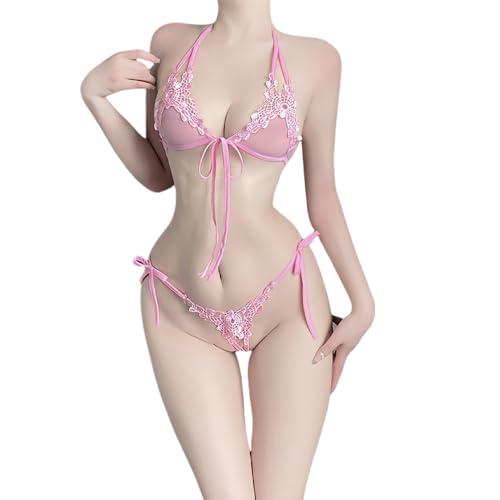 GOODLAND 超 マイクロビキニ 極薄 水着風 極小マイクロ水着コスプレ コスチューム 紐パン 紐 ホルタ―ネック ミニブラ セクシーマイクロビキニ (ピンク)