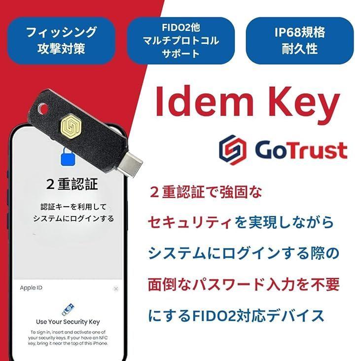 堅牢なセキュリティ:GoTrustID Idem Key は IP68規格(電子機器などの防水・防塵性のレベル)に準拠しており、高い防水・防塵性能に加え、不正開封防止、クラッシュ耐性があります
