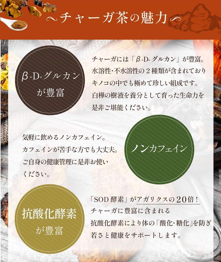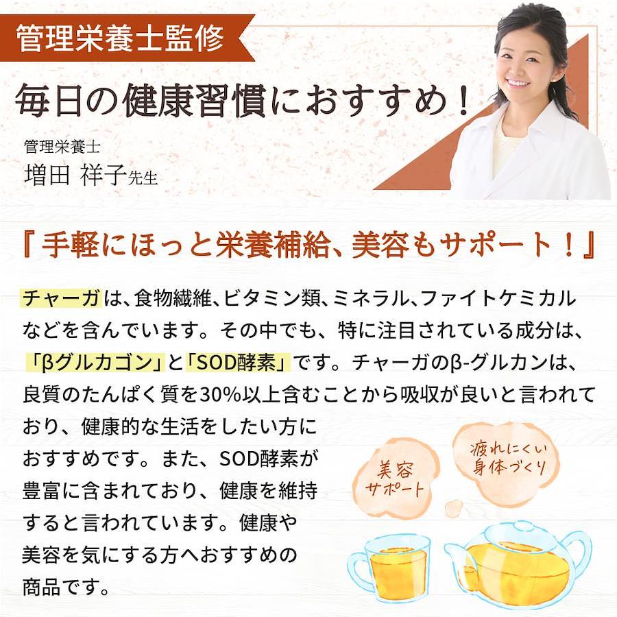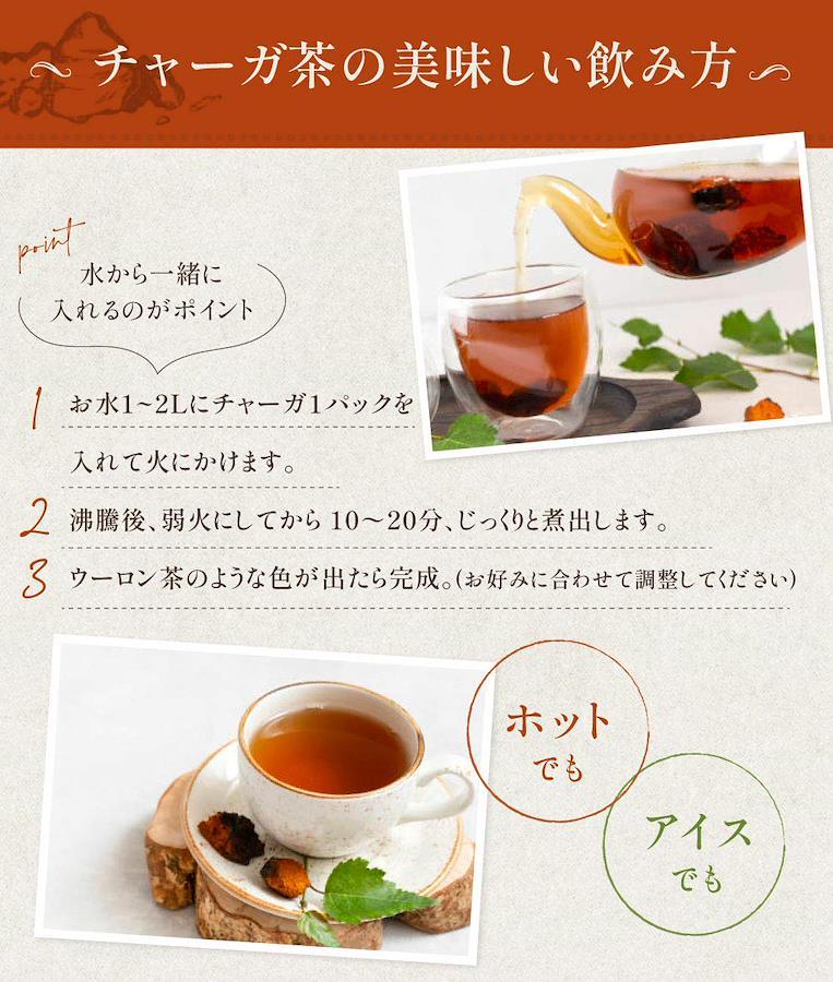 【チャーガとは?】 チャーガは、きのこの1種で、和名はカバノアナタケです。名前の由来は、「古い幹にできる黒いきのこ様のこぶ」を意味するロシア語の「チャガ」からきている様です。現在は発見困難な貴重なきのことして、「幻のきのこ」「森のダイヤモンド」と呼ばれています【ノンカフェイン】緑茶、コーヒー等に含まれるカフェインが苦手な方でも大丈夫。 ご自身の健康管理に是非お使いください。【β-D-グルカンが豊富】チャガには「β-D-グルカン」が豊富。水溶性・不水溶性の2種類が含まれており、キノコの中でも極めて珍しい組成です。 白樺の樹液を養分として育った生命力を是非ご堪能ください。【お召し上がり方】カップに入れたティーバッグに熱湯を注ぐか、ステンレス、ホーロー製鍋で煎じると、より一層濃く抽出されます。水1リットルに対してティーパック1包を入れ10~30分程度煮出ししてお飲みください。【安心の国内工場で袋詰め】安心の国内工場で、一つ一つ袋詰めをしてお届け致します。【重要】メーカーによる商品リニューアルに伴いパッケージ(内容量も含む)変更が行われた場合、新パッケージでお届け致します事ご了承願います。