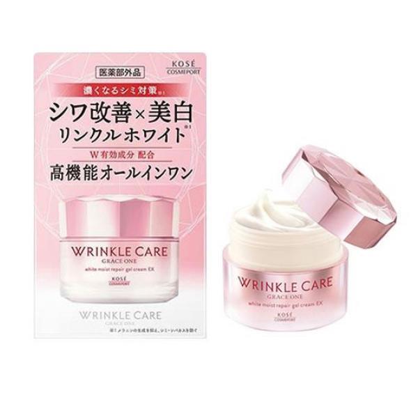 製品の特徴●グレイス ワン リンクルホワイトジェル(GRACE ONE WRINKLE CARE white moist repai gel cream EX)●医薬部外品●1品7役、シワを改善し美白(*)効果のある高機能オールインワンジェル。[*メラニンの生成を抑制し、シミ・そばかすを防ぐ]●W有効成分配合。高機能モイストブライト成分配合。●なめらかなジェルクリームで肌(角層)のうるおい低下を防ぎながらシワ悩みとシミ悩みをケアします。●濃くなるシミもケアするシワ改善×美白のオールインワン。●シワ改善・美白有効成分:ナイアシンアミド配合。●消炎有効成分:トラネキサム酸配合。●化粧水、シワ改善美容液、美白美容液、乳液、クリーム、マッサージ、アイクリーム1品7役。●みずみずしいリラックスフローラルの香り。●販売名:グレイス ワン リンクルケア ホワイト モイストリペア ジェルクリーム EX