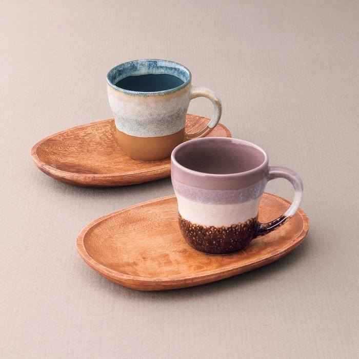 マグはたっぷりサイズで、アカシアのトレーがセットとなります。