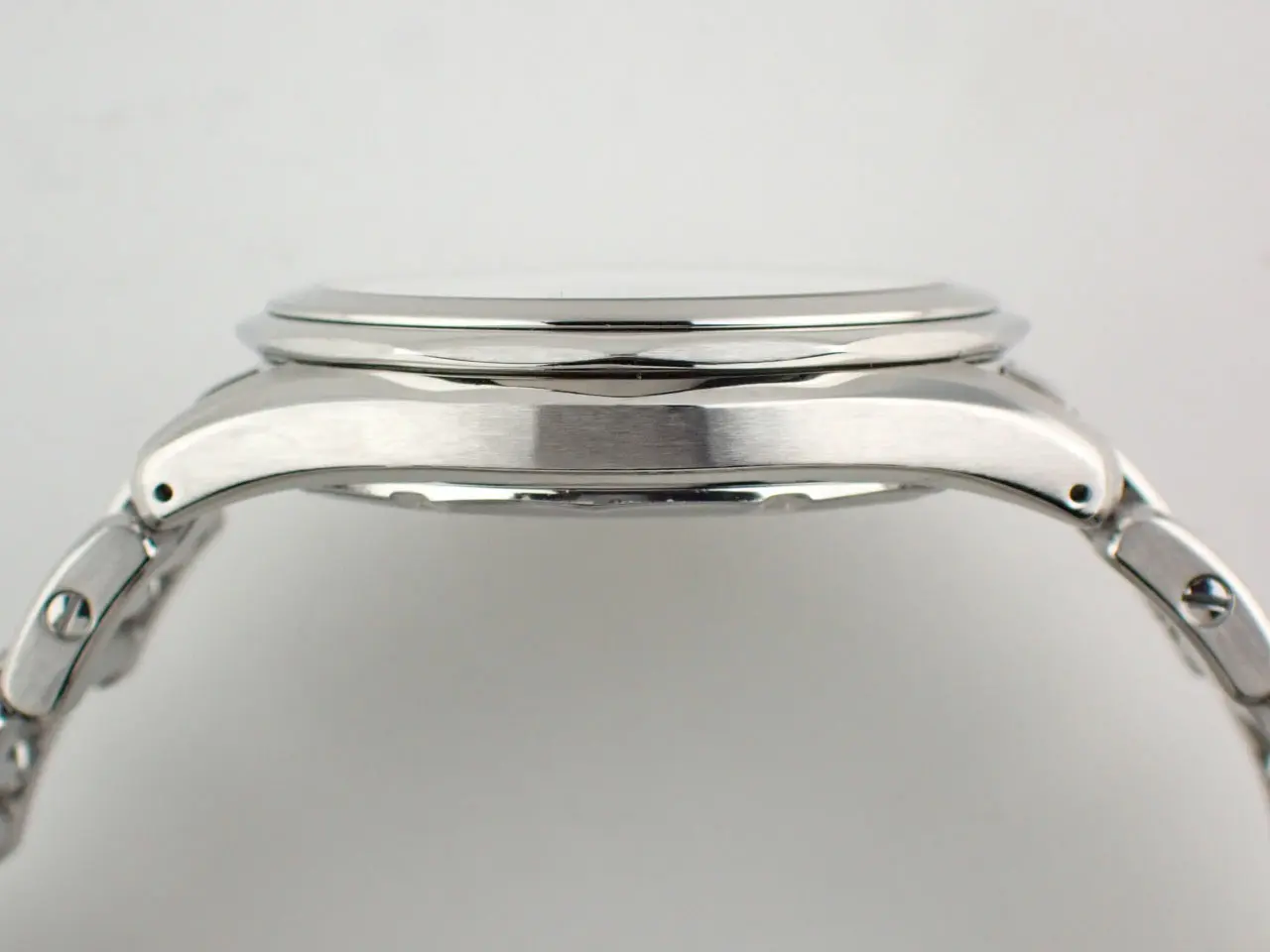 こちらの時計は、同社の高精度なクオーツウォッチ。ホワイトカラーのダイヤルは、スクエアパターンの彫りが施され、清潔感がありながら豊かな表情を魅せます。現行モデルにはなく大変手の込んだ作りの12角のベゼルがシャープな印象。12と6時位置のインデックスが厚みのあるアラビア数字なのも、静かに存在感を発揮します。