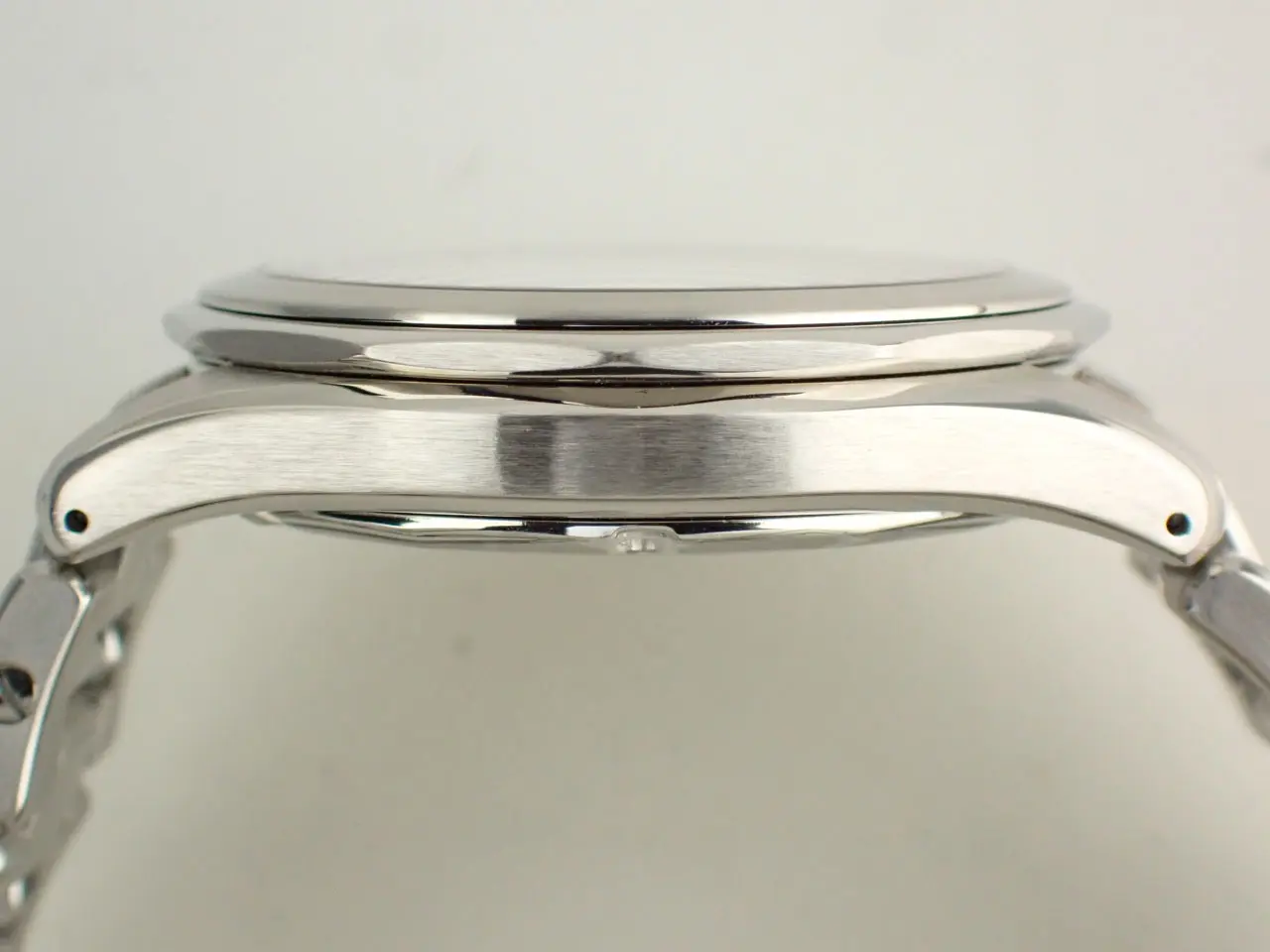 こちらの時計は、同社の高精度なクオーツウォッチ。ホワイトカラーのダイヤルは、スクエアパターンの彫りが施され、清潔感がありながら豊かな表情を魅せます。現行モデルにはなく大変手の込んだ作りの12角のベゼルがシャープな印象。12と6時位置のインデックスが厚みのあるアラビア数字なのも、静かに存在感を発揮します。