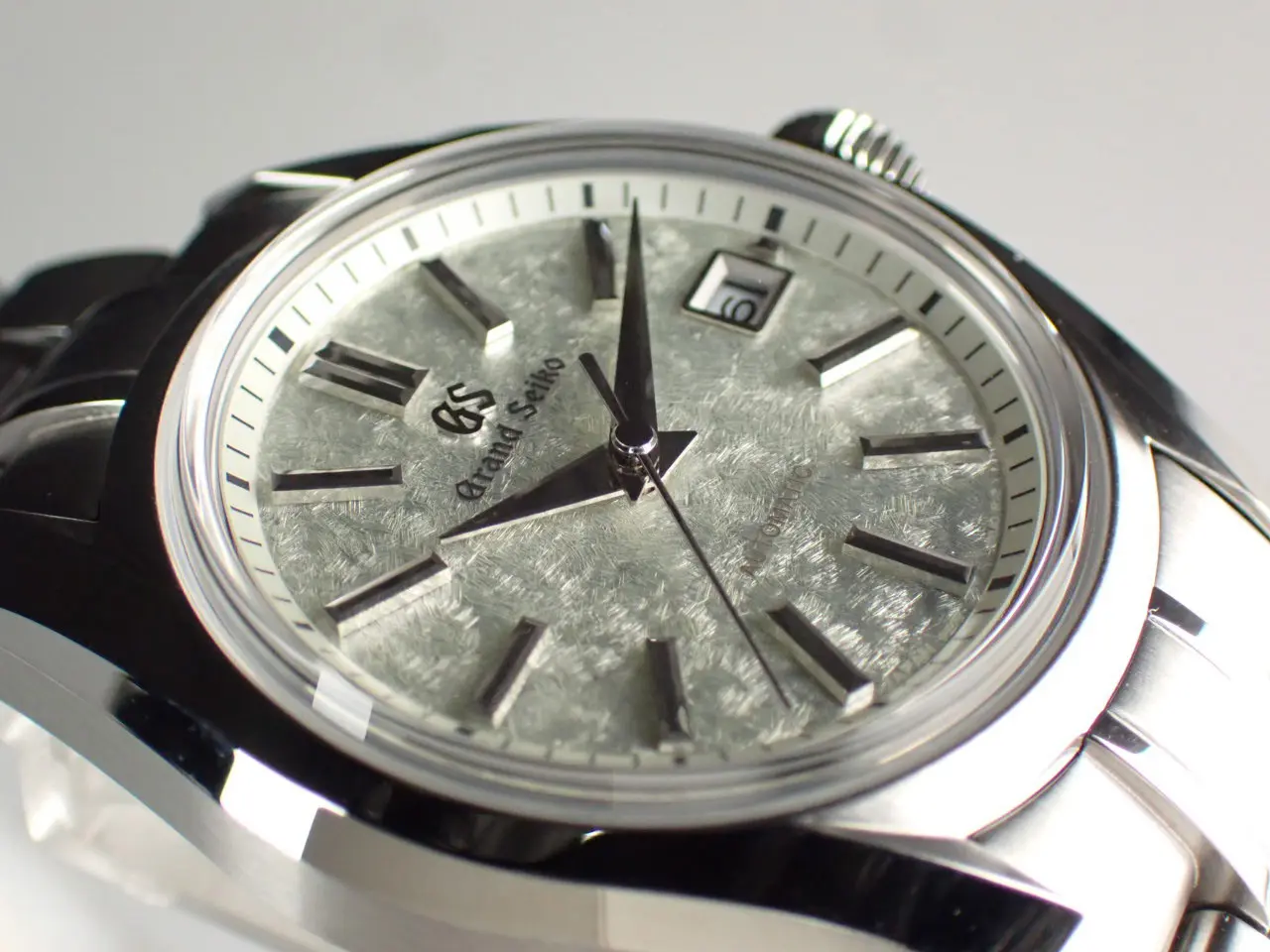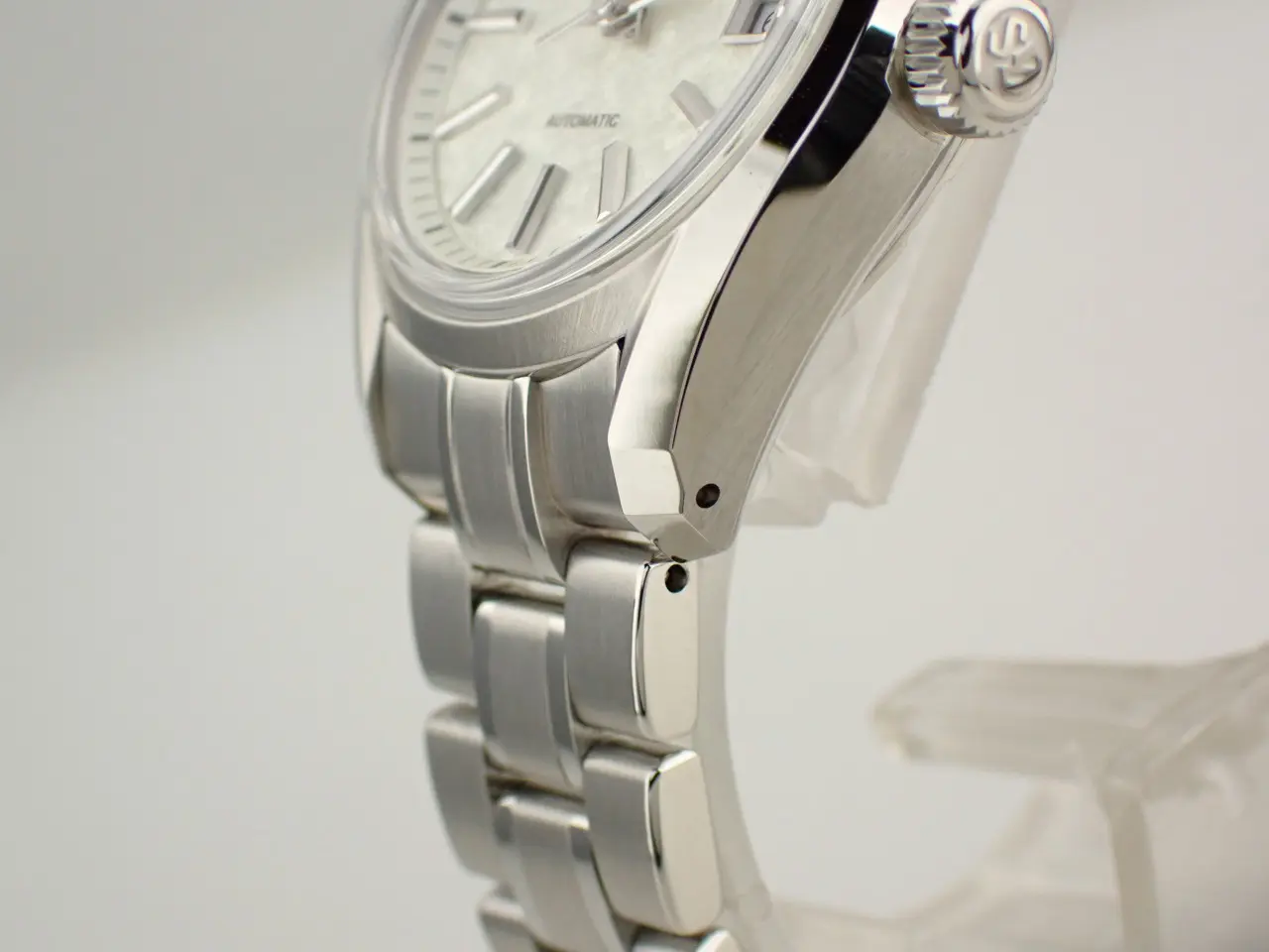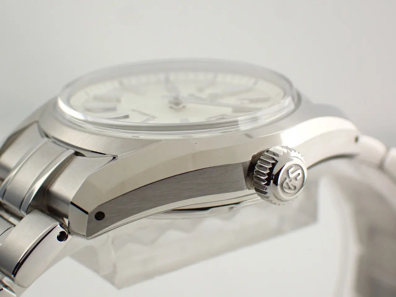 こちらの時計は、グランドセイコー初の自動巻メカニカル「62GS」を現代的解釈でアレンジしたレディースモデル。ベゼルの無い広々と見えるダイヤルと、「ザラツ研磨」による多面体ケースが特徴です。ダイヤルは「桜月夜」から着想を得てデザインされています。春先の朧げな月明かりに照らされる桜の情景を、繊細な型打ち模様とシルバーカラーのダイヤルで表現。