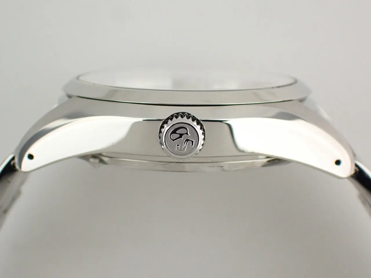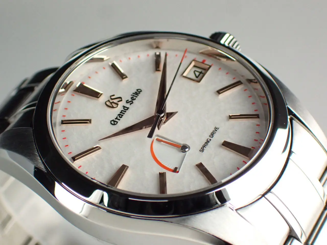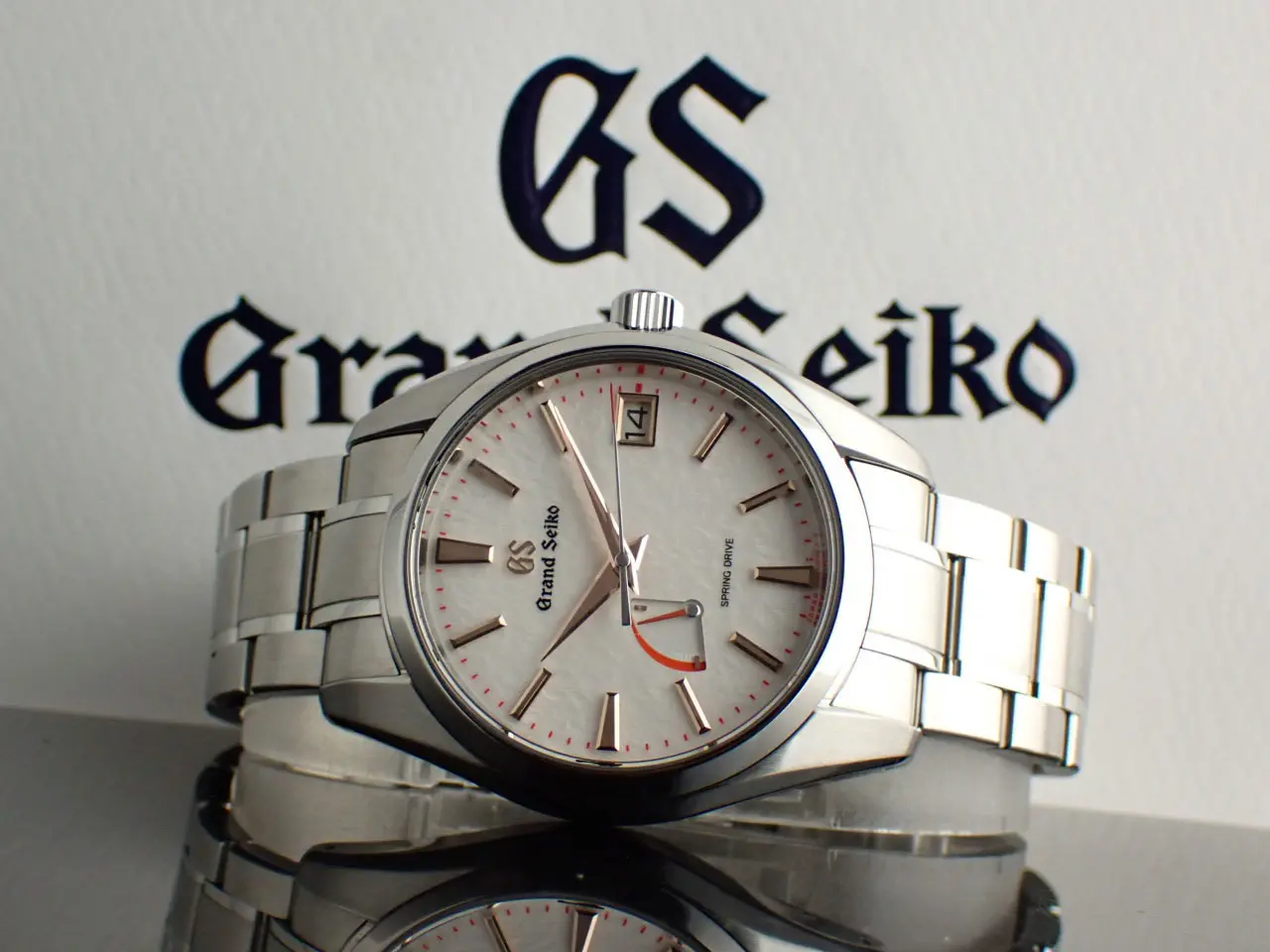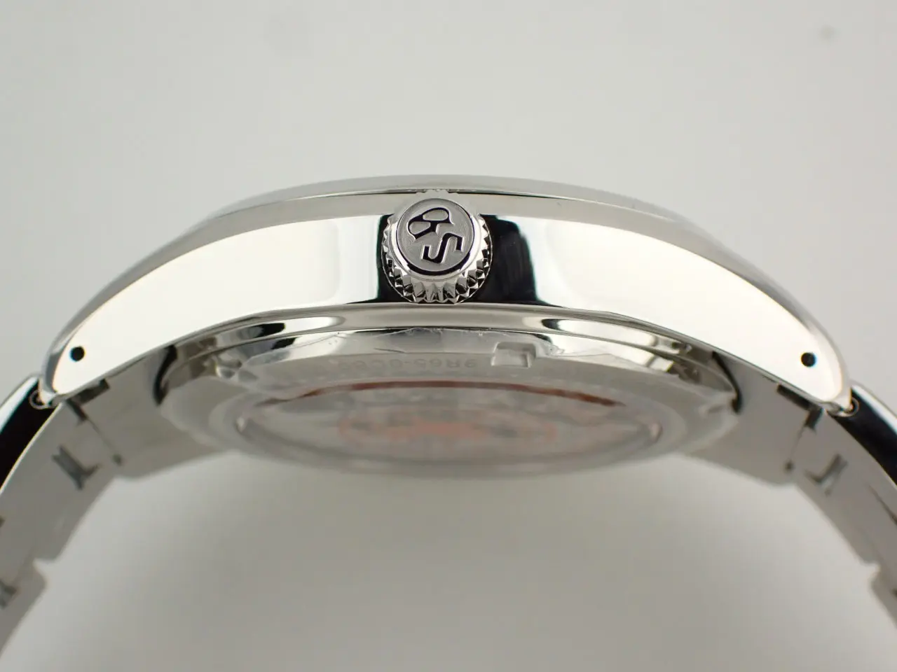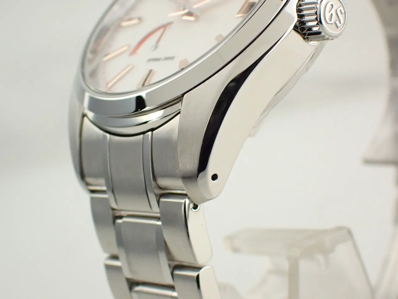 こちらの時計は、2022年発売。百貨店「西武」「そごう」のみで73本で発売された、限定モデルです。GSの代表デザインである「雪白」ダイヤルを採用。インデックスと時分針にはピンクゴールドカラーを、ミニッツマーカーとパワーインジケーターには朱色のようなレッドカラーを採用。朝焼けからインスパイアされています。ケースは丁寧に磨き分けられた、GSを支えてきた伝統的なデザインです。