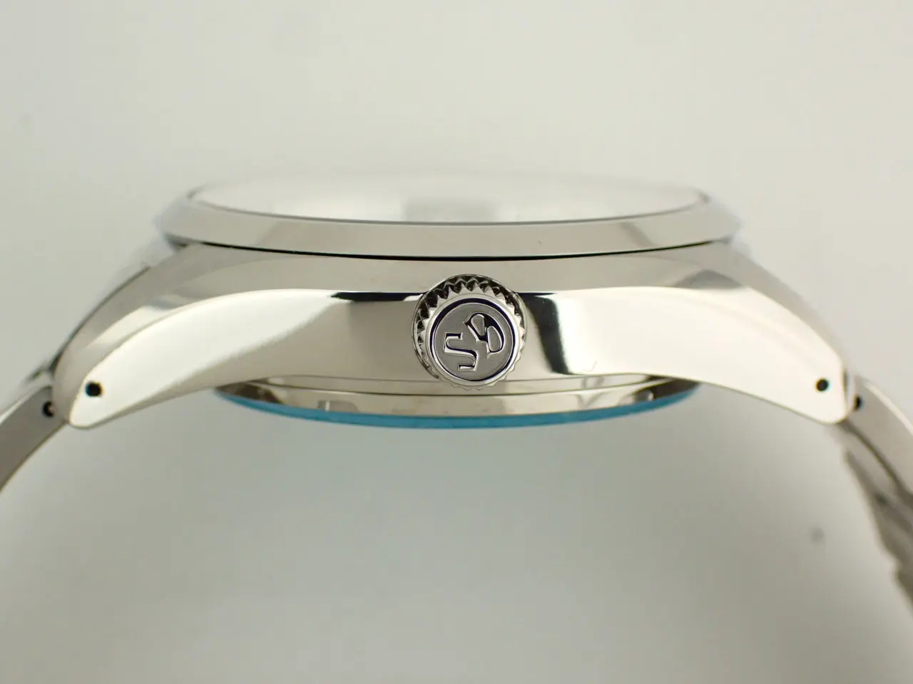 こちらは、雪白(snowflake)と呼ばれる美しいダイヤルの、国内外で非常に人気の高いモデル。信州の工房から望める穂高連峰の、穢れのない荘厳な深雪がインスピレーションとされます。繊細な凹凸の上にそっと置かれた多面カットのインデックスと時分針は屈指の職人によって研磨されており、ダイヤモンドダストのような輝きです。加えて細やかな彫りを施すことで高い視認性を確保。