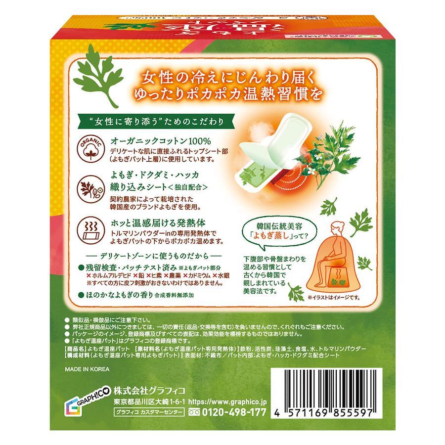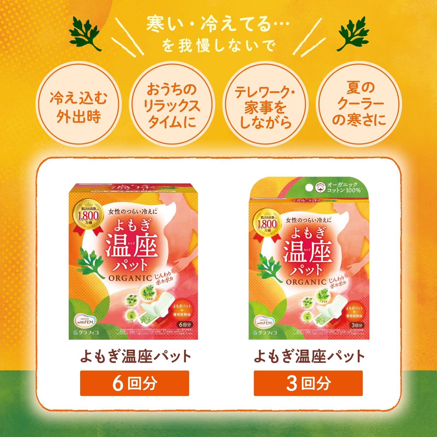 バージョンアップし新ブランドとしてリニューアル。肌にふれるトップシートをオーガニックコットン100%不織布へ、カイロの温度の温かさアップ。女性の冷えにじんわり届く、韓国産よもぎとドクダミ・ハッカが配合された女性のためのナプキン型温熱パットです。 バージョンアップし新ブランド「ウィズフェム」としてリニューアル。 肌にふれるトップシートをオーガニックコットン100%不織布へ、カイロの温度の温かさアップ。 女性の冷えにじんわり届く、韓国産よもぎとドクダミ・ハッカが配合された女性のためのナプキン型温熱パットです。 【原材料・成分】 よもぎ温座パット専用発熱体…鉄粉、活性炭、珪藻土、食塩、水、トルマリンパウダーパット内部…よもぎ、ハッカ、ドクダミ配合シート 【内容量】6回分(よもぎパッド+専用発熱体)