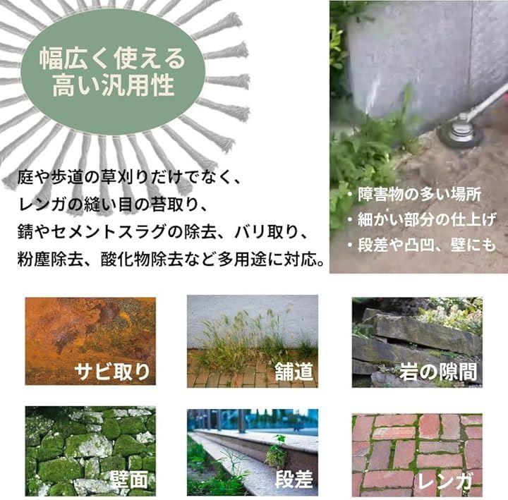 「様々な場面に対応」庭や歩道の草刈りだけでなく、レンガの縫い目の苔取り、錆やセメントスラグの除去、バリ取り、粉塵除去、酸化物除去など多用途に対応。