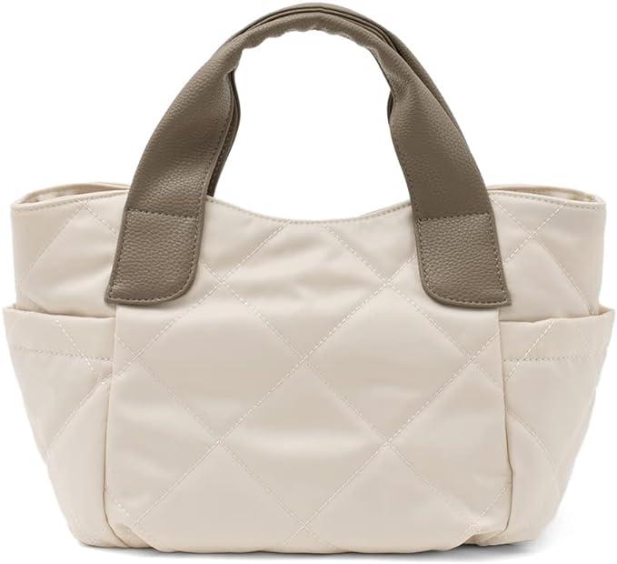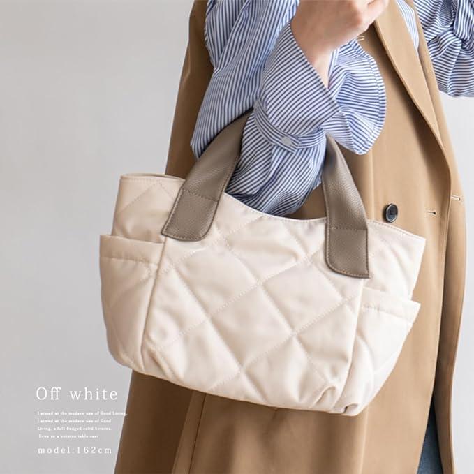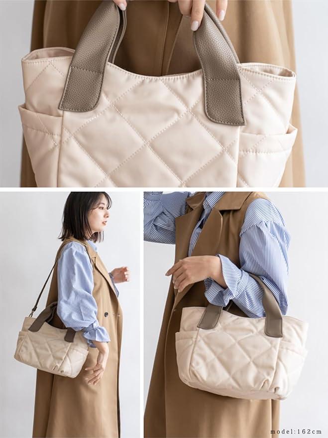 大きめのキルティングが女性らしい2wayトートバッグ。 キルティング加工を施した丈夫な高密度ナイロンを使用し、上品で優しい雰囲気のバッグに仕上げました。 しっかりとマチが広く、普段使いはもちろん通勤バッグとしてもオススメです。 付属のショルダーベルトで肩掛け・斜め掛けができるのもお仕事バッグには必要なポイント。 シボのあるフェイクレザーのハンドルを合わせ、ナイロンとのコンビにすることでまとまりのあるデザインに。