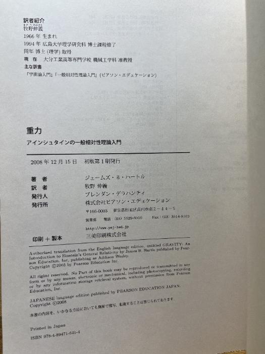b03-260115002002015-000重力 アインシュタインの一般相対性理論入門 ピアソンエデュケーション ジェームズ・B・ハートル最小限の数学で学べる一般相対性理論の画期的教科書!本書は「世界天文年2009日本委員会公認」書籍に選ばれました。アインシュタインの一般相対性理論は、現代物理学に欠かせない基礎である。それは、ブラックホール、曲がった時空、重力波、宇宙論などの豊かな話題を提供し、学ぶものすべてを魅了する。しかしこの学習には、微分幾何学の知識を身に付け,アインシュタイン方程式を導入しなければならない大きな壁があった。本書は、学部のカリキュラムに一般相対性理論を取り入れ、物理専攻の可能性を持つすべての学生がこの基礎理論を学べるようにした、画期的な教科書である。高名な相対性理論物理学者のジェームス・ハートルは、科目へのアプローチとして「まずは物理を!」をかかげ、複雑な数学は最小限ですませながら物理現象への理論適用を説明し、一般相対性理論を取り組みやすいものしている。学生にとっては、学ぼうとしている重力物理学から始められ、難しい数学でつまずくことがなく理論を身につけられる。9784894716414<%% SHIPPING %%>三方小口に、若干の、薄ヤケがあります。本は使用感少なく、おおむね良好な状態です。※注意事項※■商品・状態はコンディションガイドラインに基づき、判断・出品されております。■付録等の付属品がある商品の場合、記載されていない物は『付属なし』とご理解下さい。