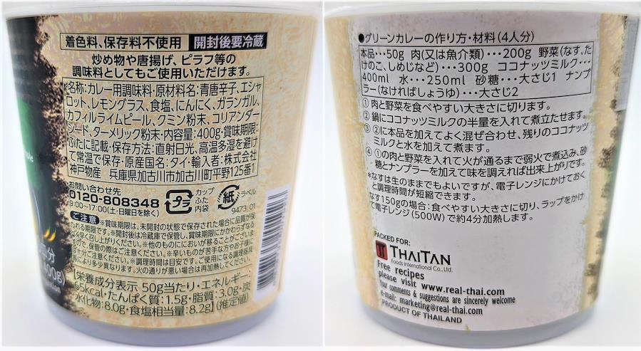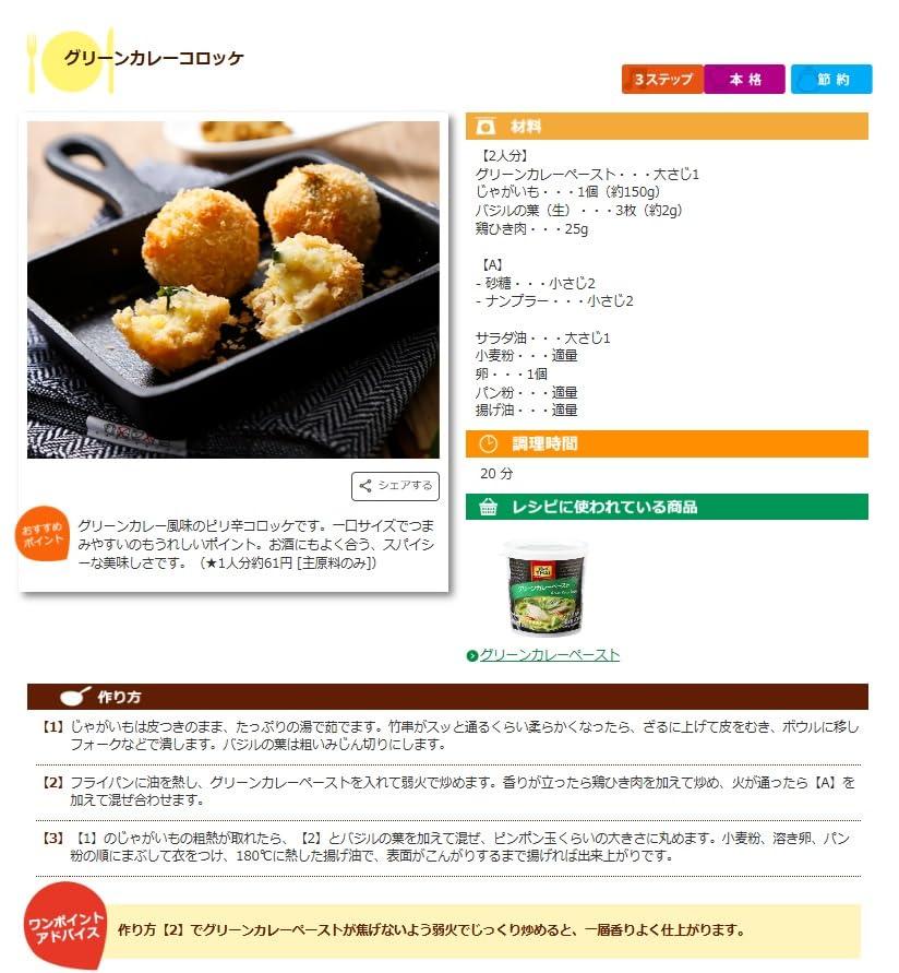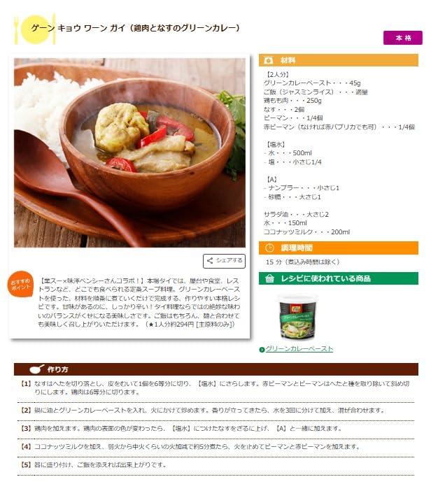 内容量 400g 原産国 タイ保存方法 直射日光、高温多湿を避けて常温で保存栄養成分: 大さじ1杯(約15g当たり) ●エネルギー:20kcal ●たんぱく質:0.5g ●脂質:1.0g ●炭水化物:2.4g ●食塩相当量:2.5gアレルギー - ※商品の仕様変更により、アレルギー情報が異なる場合がございます。召し上がる際は、必ずお買い求めいただいた商品のラベルや注意書きをご確認ください。入れる具材を変えるだけで、多彩なアレンジができるグリーンカレーペーストです。 合成着色料や保存料は不使用。青唐辛子、エシャロット、レモングラス、ターメリックなどさまざまなスパイスを使用し、バランスよく仕上げました。 ココナッツミルク、野菜、肉またはシーフードがあれば、簡単に本格タイカレーを作ることができます。お好みでナンプラーやヨーグルトを加えると、まろやかな味わいに。1個(400g)で約30皿分というコストパフォーマンスの良さも魅力です。【重要】メーカーによる商品リニューアルに伴いパッケージ(内容量も含む)変更が行われた場合、新パッケージでお届け致します事ご了承願います。